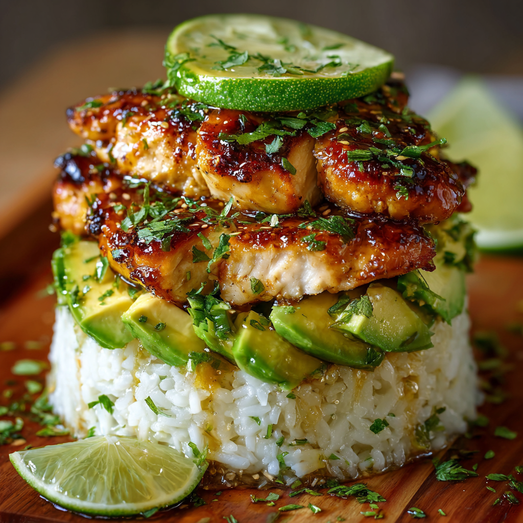 A layered stack of tangy-honey chicken, creamy avocado, and lime‑infused rice—colorful, nutritious and ready in about 30 minutes.