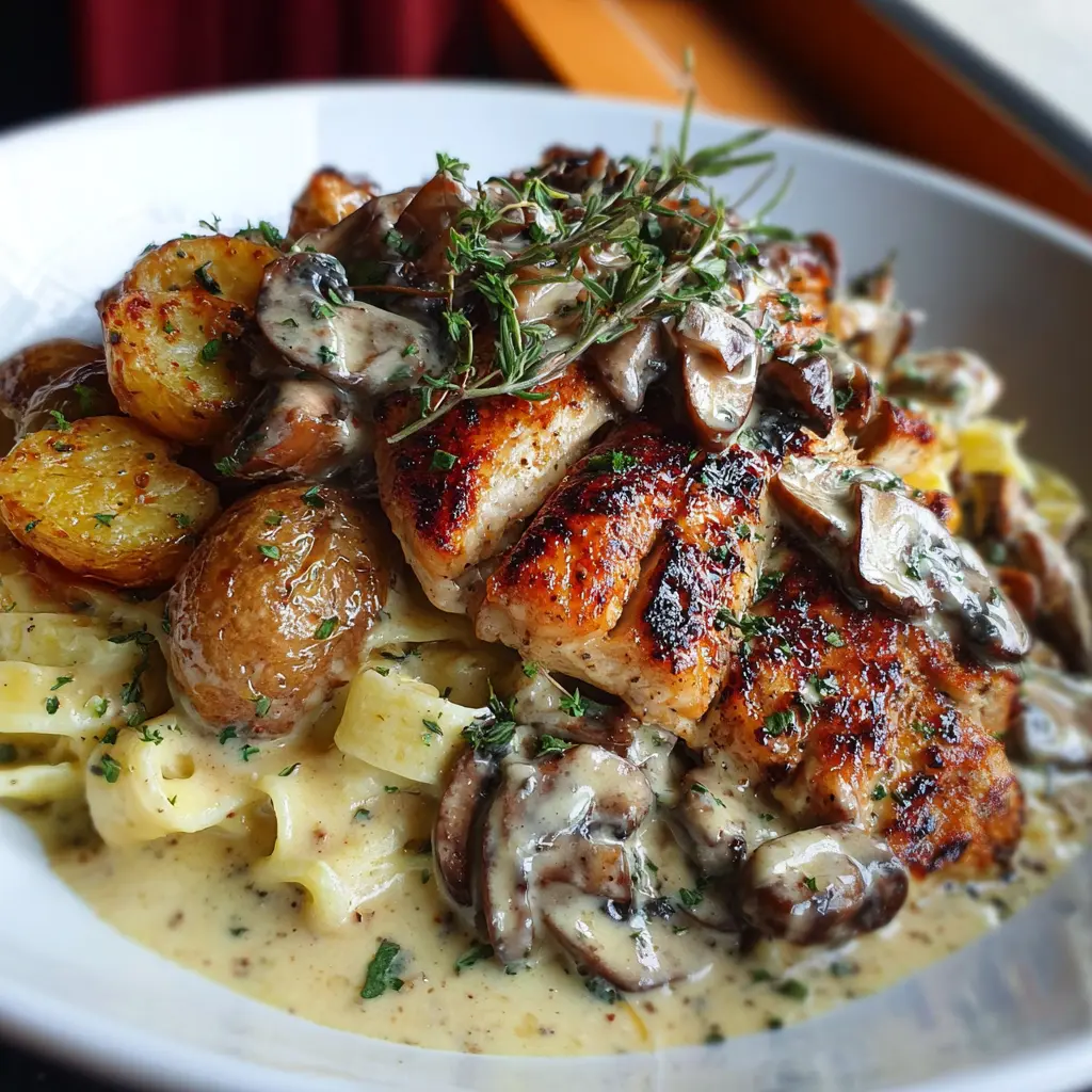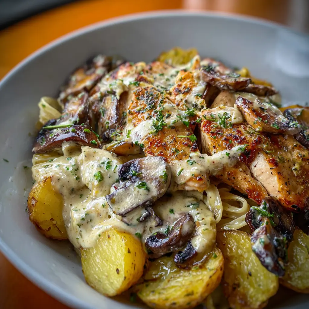 Indulge in a creamy and flavorful Greek hot honey garlic chicken alfredo, paired with roasted potatoes and fig-balsamic mushroom cream.