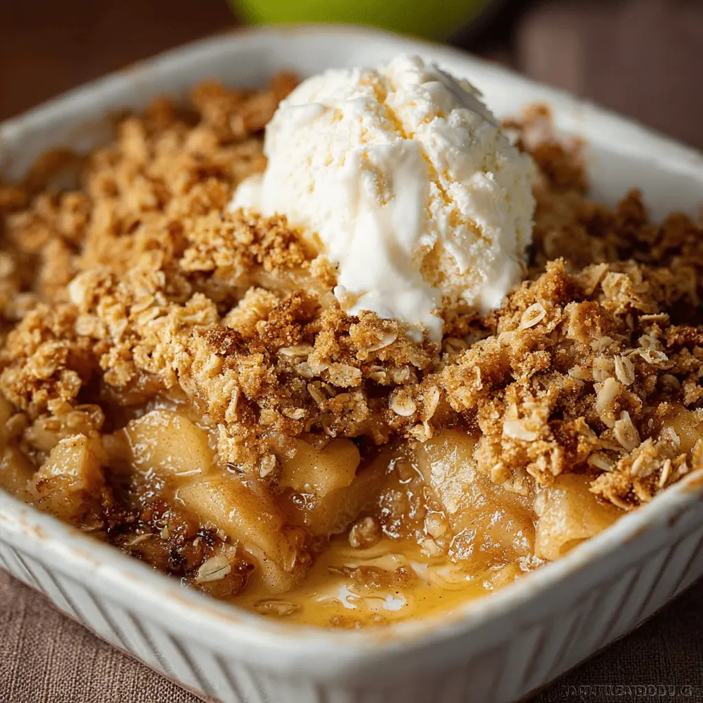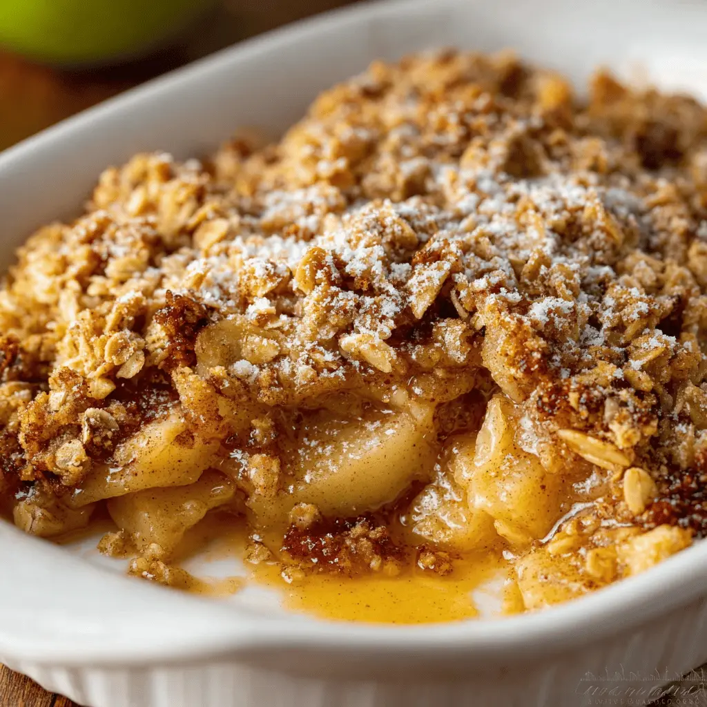 Delicious apple crisp topped with a buttery oat mixture, perfect for dessert.