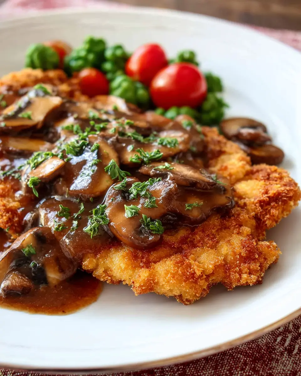 - Place a crispy schnitzel on a plate and generously ladle the mushroom gravy over the top.