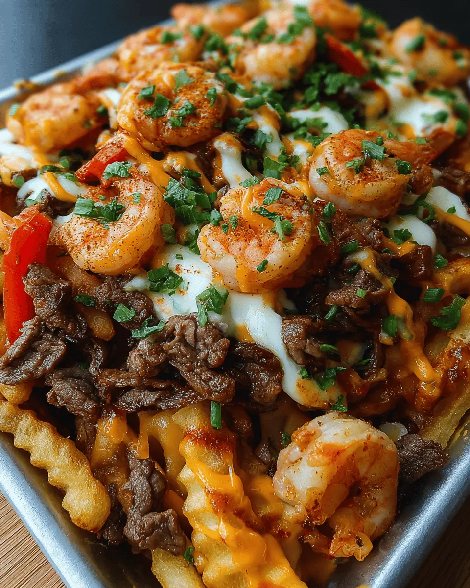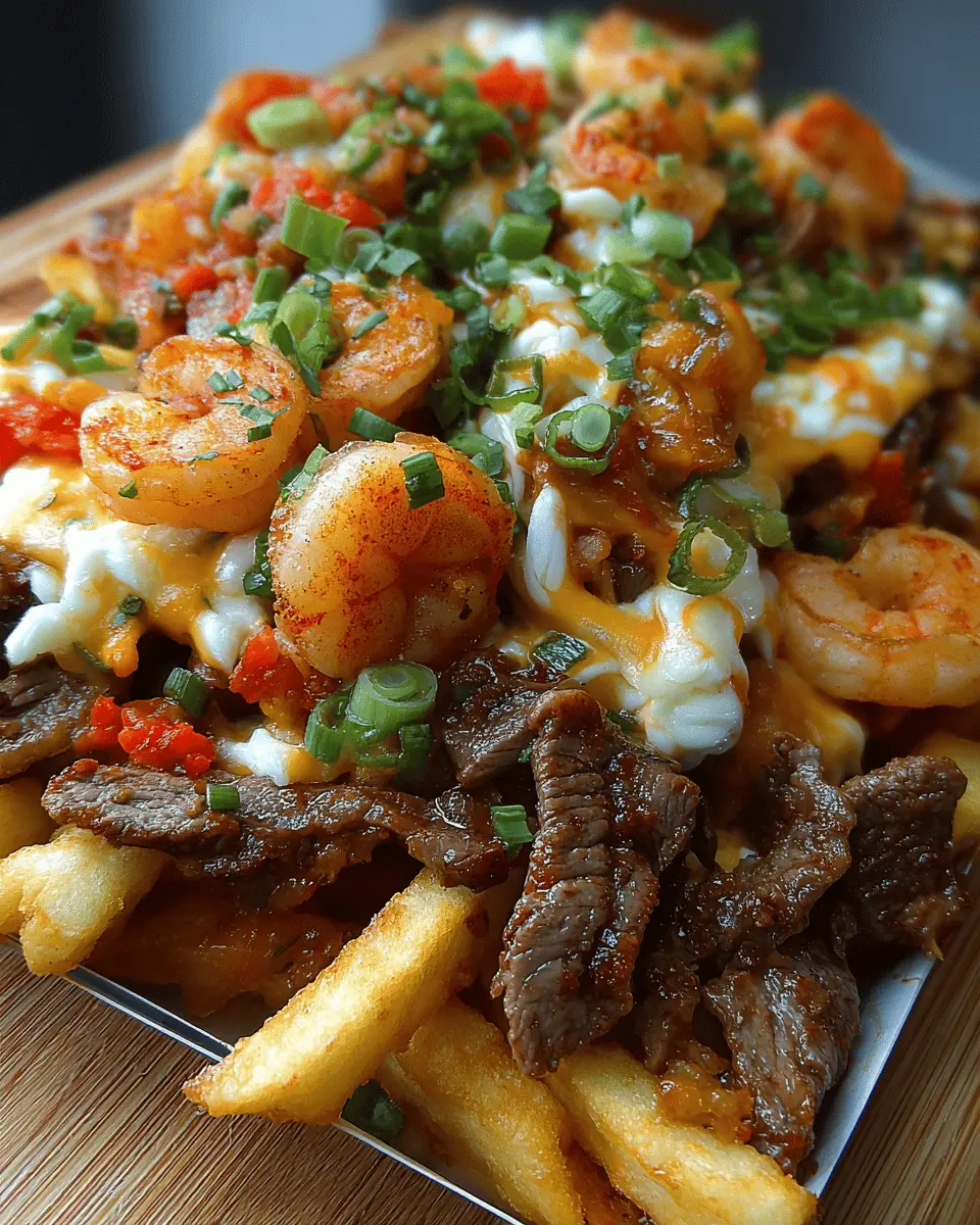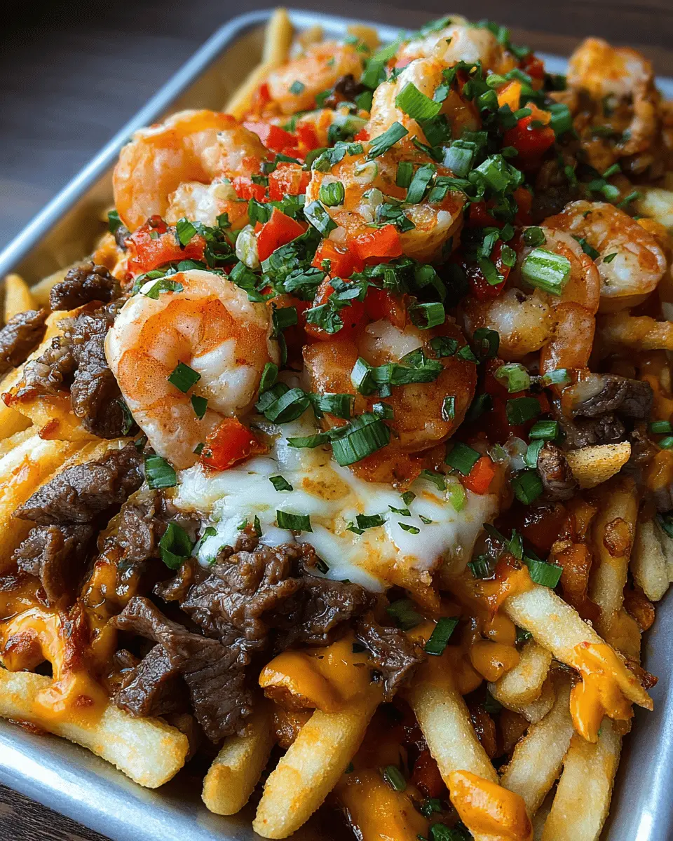 Indulge in the rich flavors of Beef & Shrimp Loaded Fries, a perfect comfort food dish that everyone will enjoy.