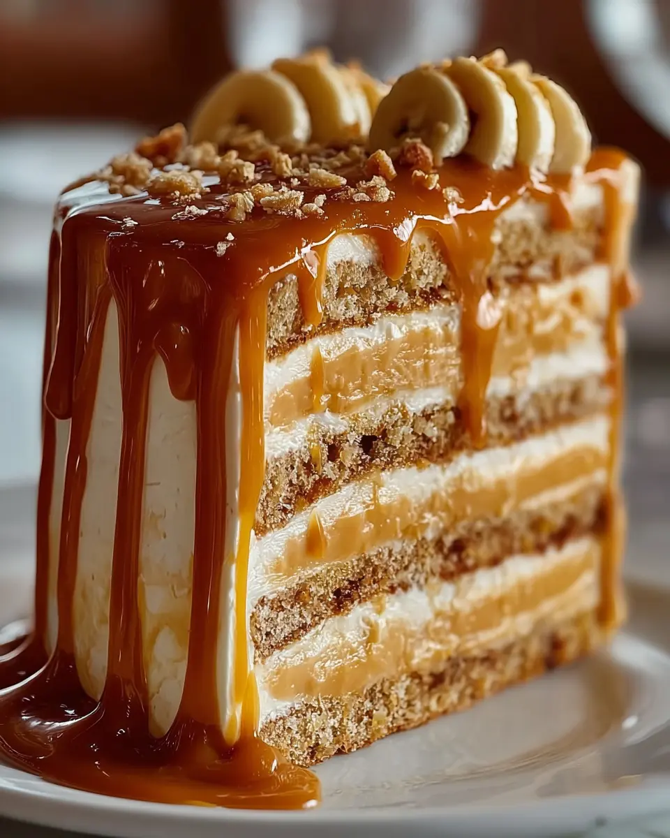 This cake brings together the goodness of bananas and the sweetness of caramel. Here's a quick overview of what you'll find in each slice: