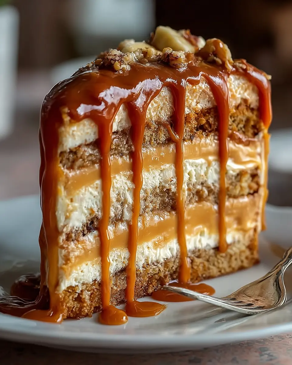 Presentation goes a long way! Try stacking slices of your caramel banana layer cake on a tiered cake stand for an elegant touch. Dust the top with powdered sugar and sprigs of mint for a pop of color. For a casual gathering, serve it on rustic wooden boards alongside fresh banana slices and small bowls of caramel sauce for drizzling, inviting guests to customize their experience.
