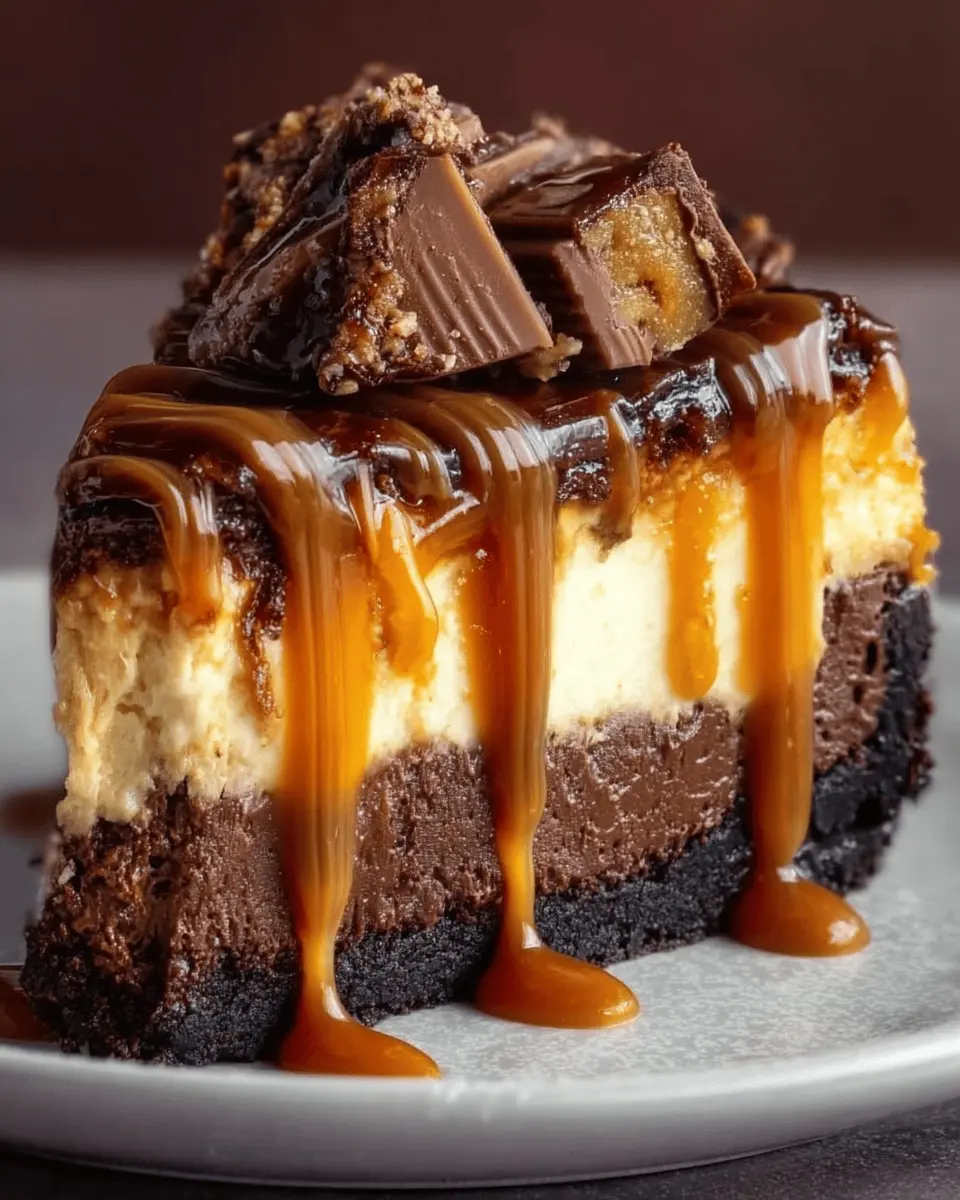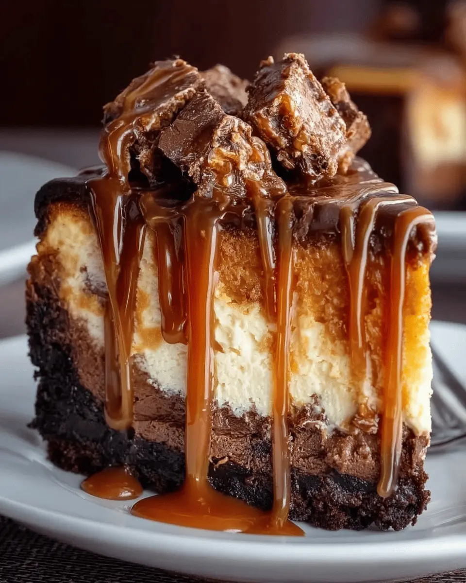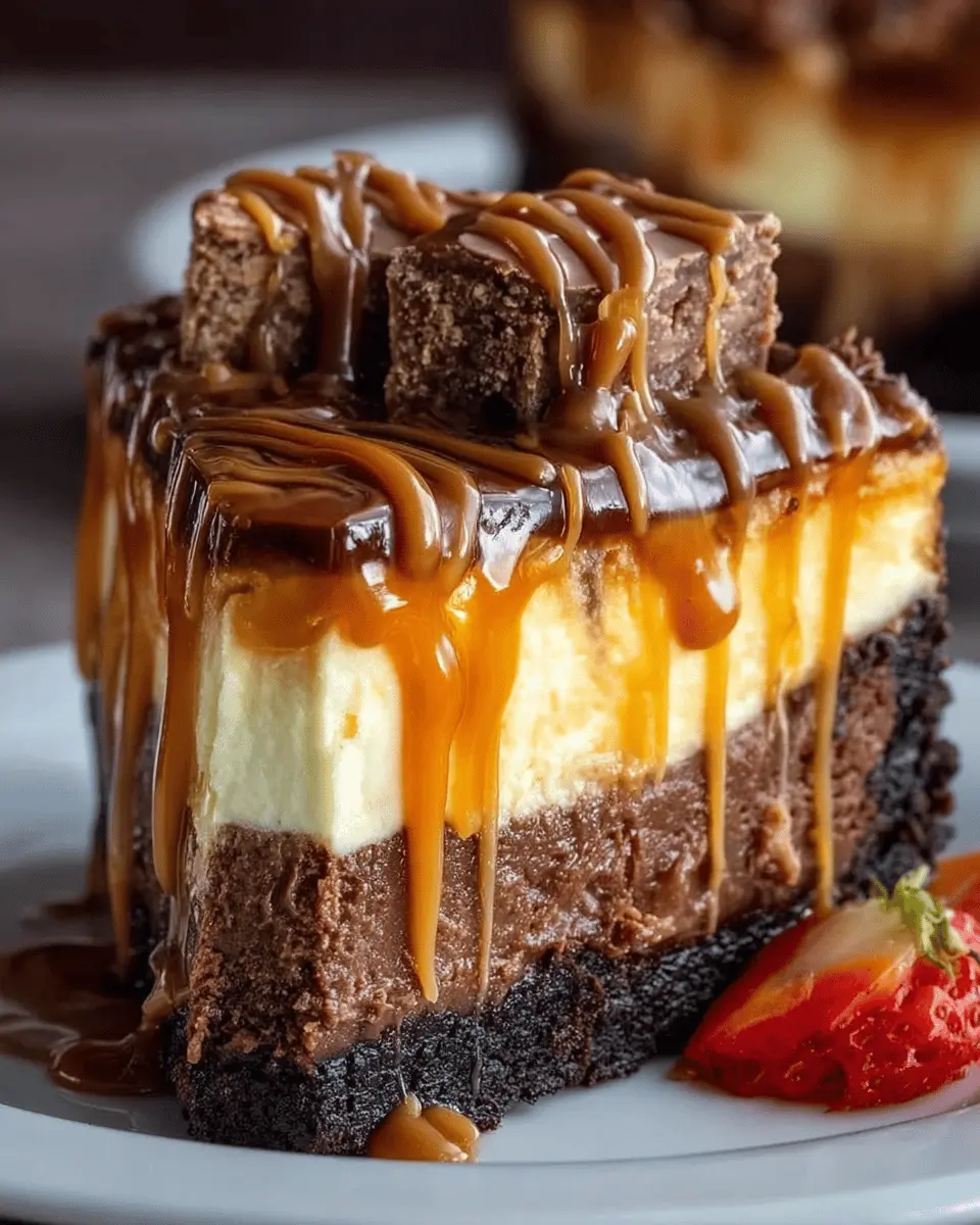Indulge in the rich flavors of caramel, brownie, and cheesecake with this delightful dessert!