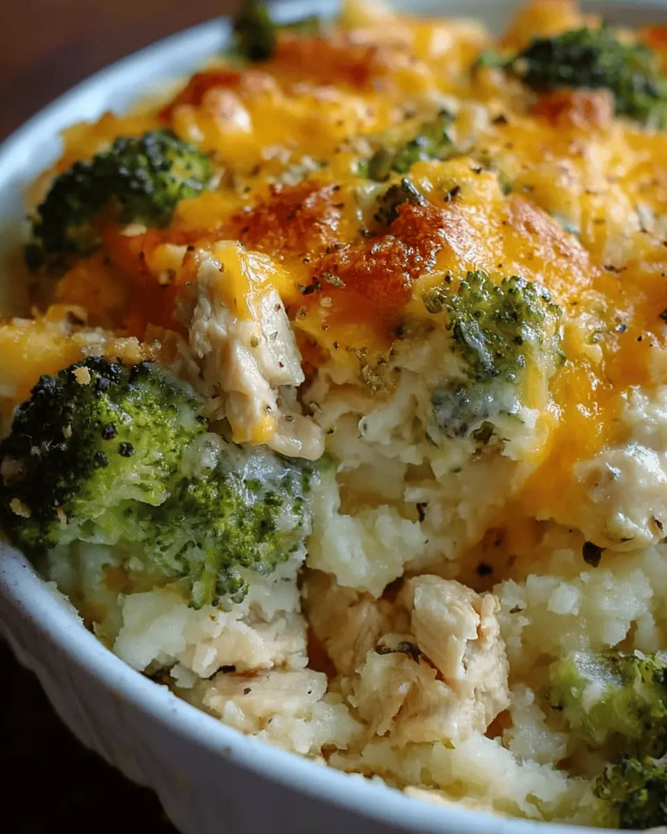 A delicious and hearty casserole combining tender chicken, creamy cheesy potatoes, and healthy broccoli.