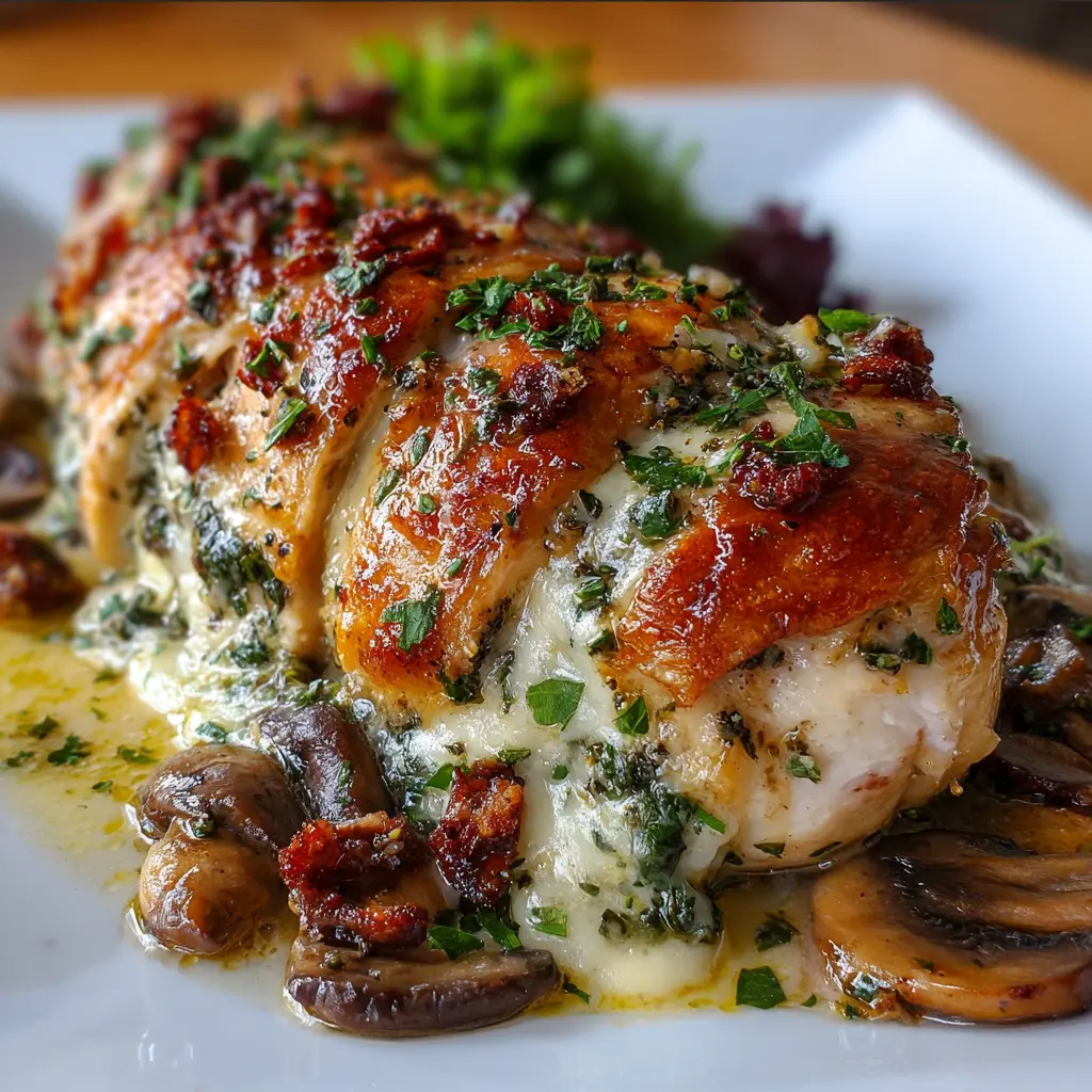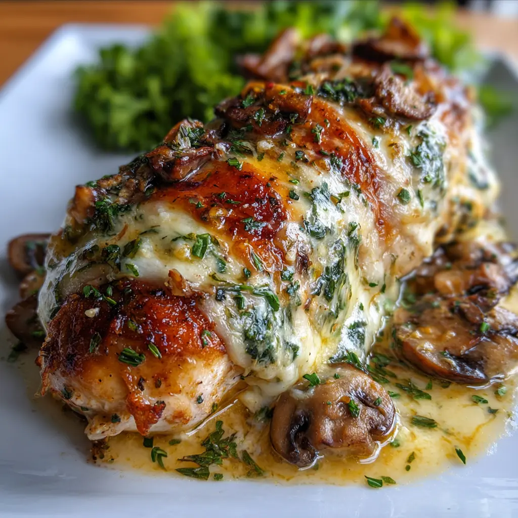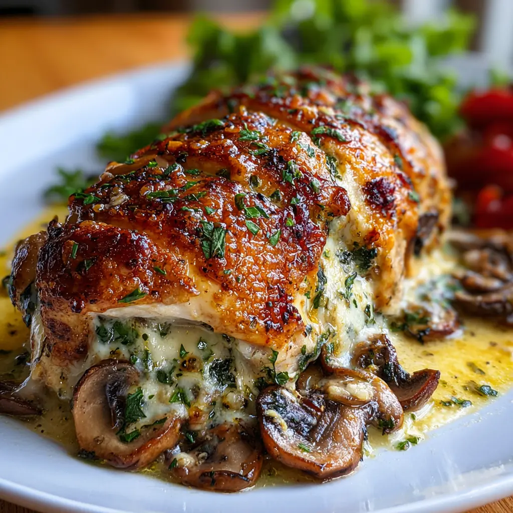 Indulge in the savory goodness of Cheesy Garlic Butter Mushroom Stuffed Chicken, a dish that combines juicy chicken with a rich and creamy mushroom filling.