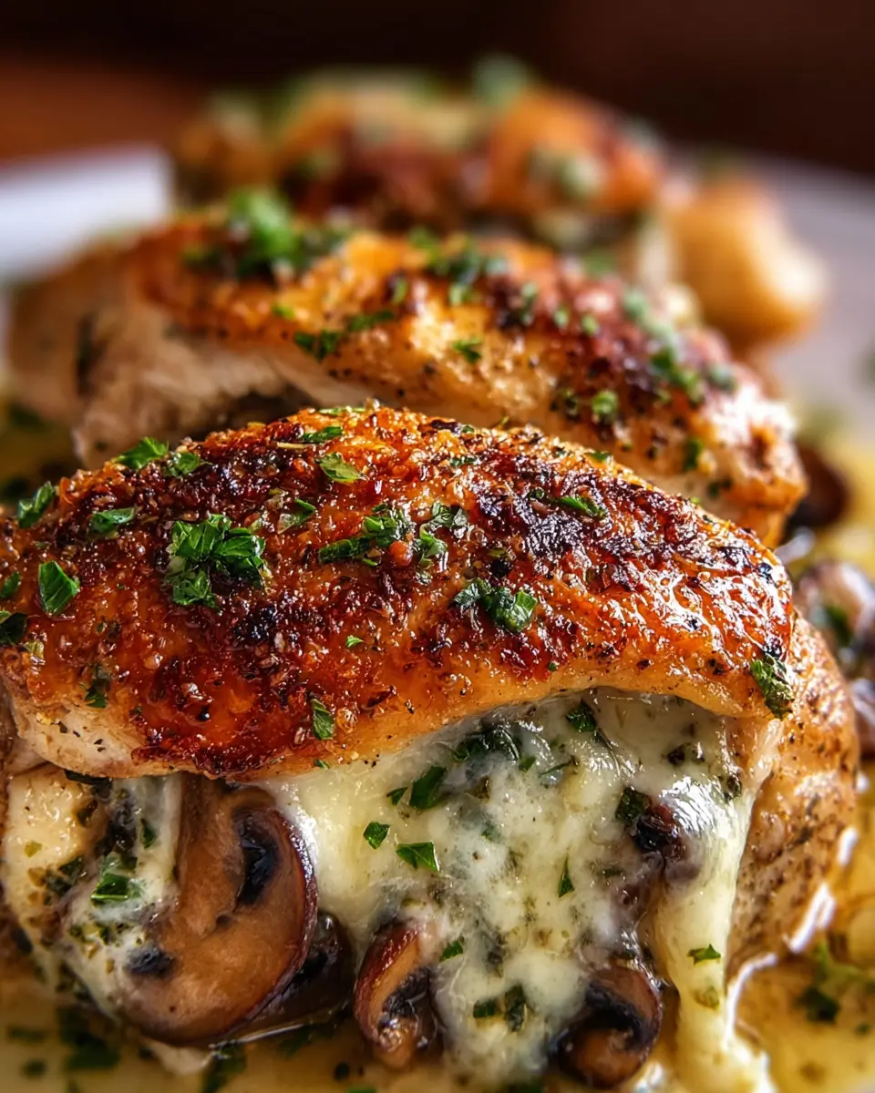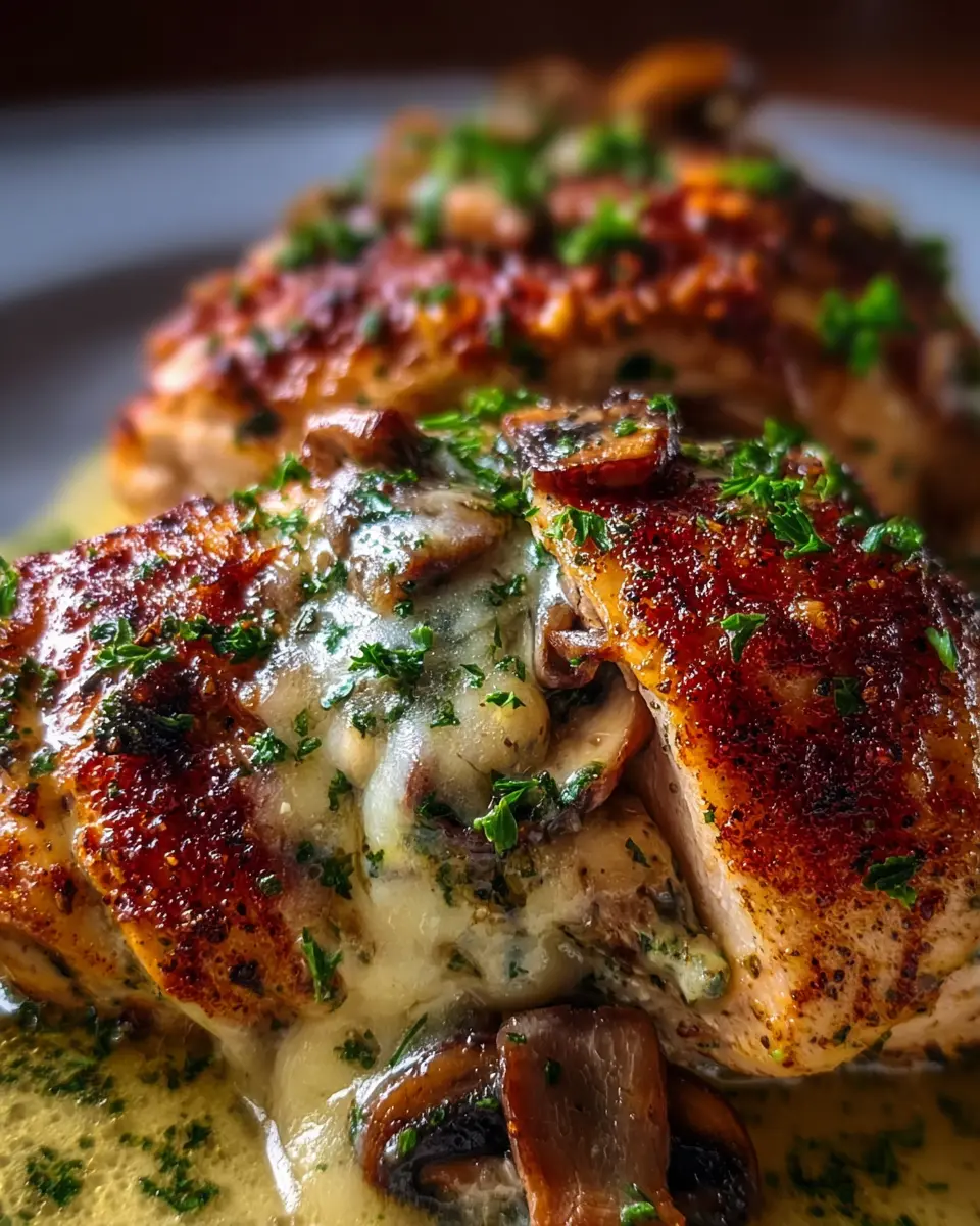 Indulge in the rich flavors of Cheesy Garlic Butter Mushroom Stuffed Chicken, perfect for a cozy dinner.