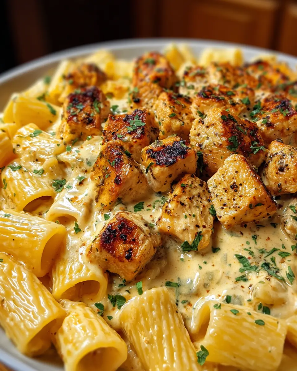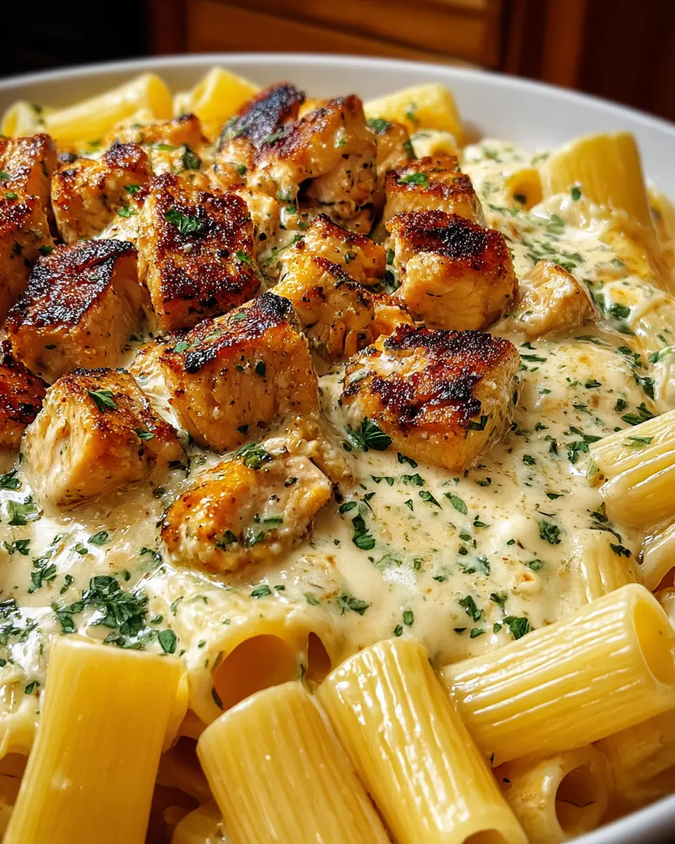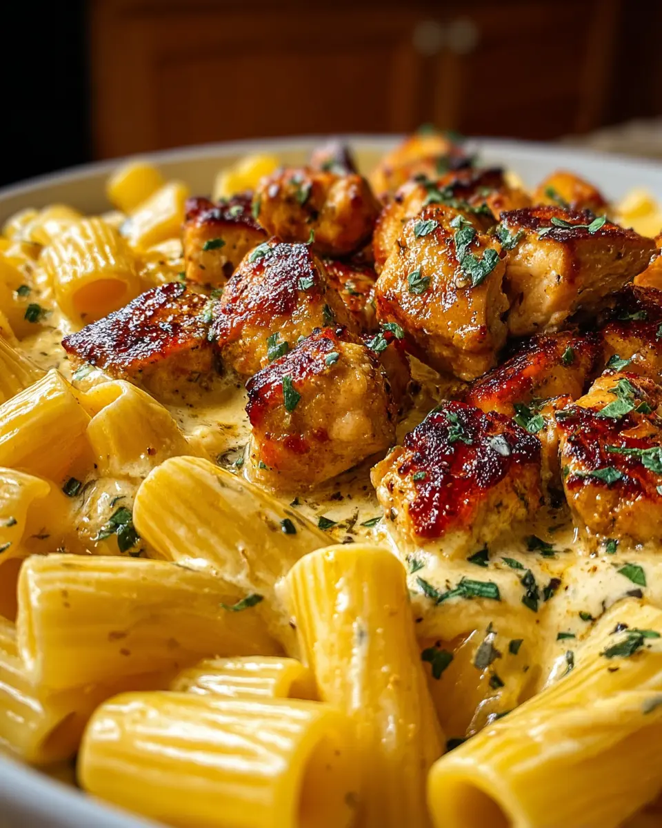 A delicious and creamy dish featuring tender chicken bites and rigatoni pasta in a rich cheddar parmesan garlic cream sauce.