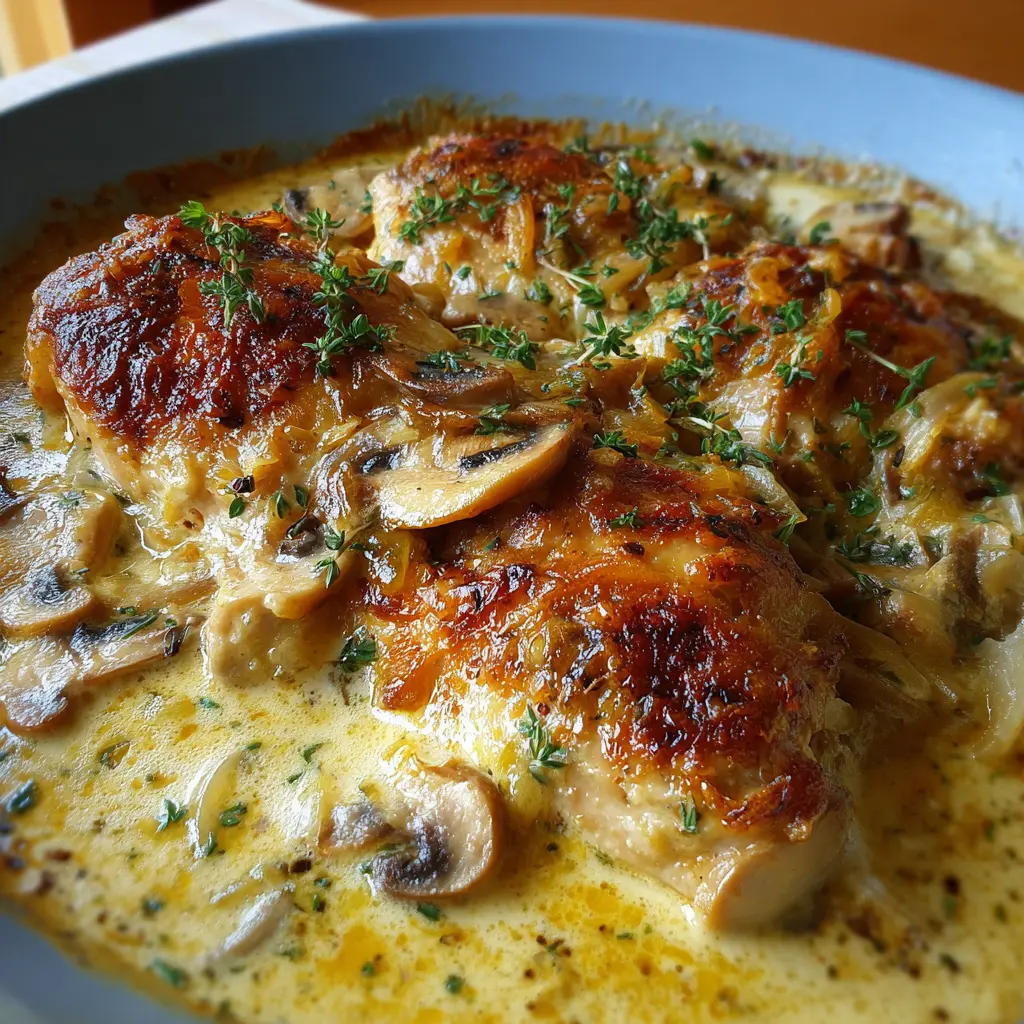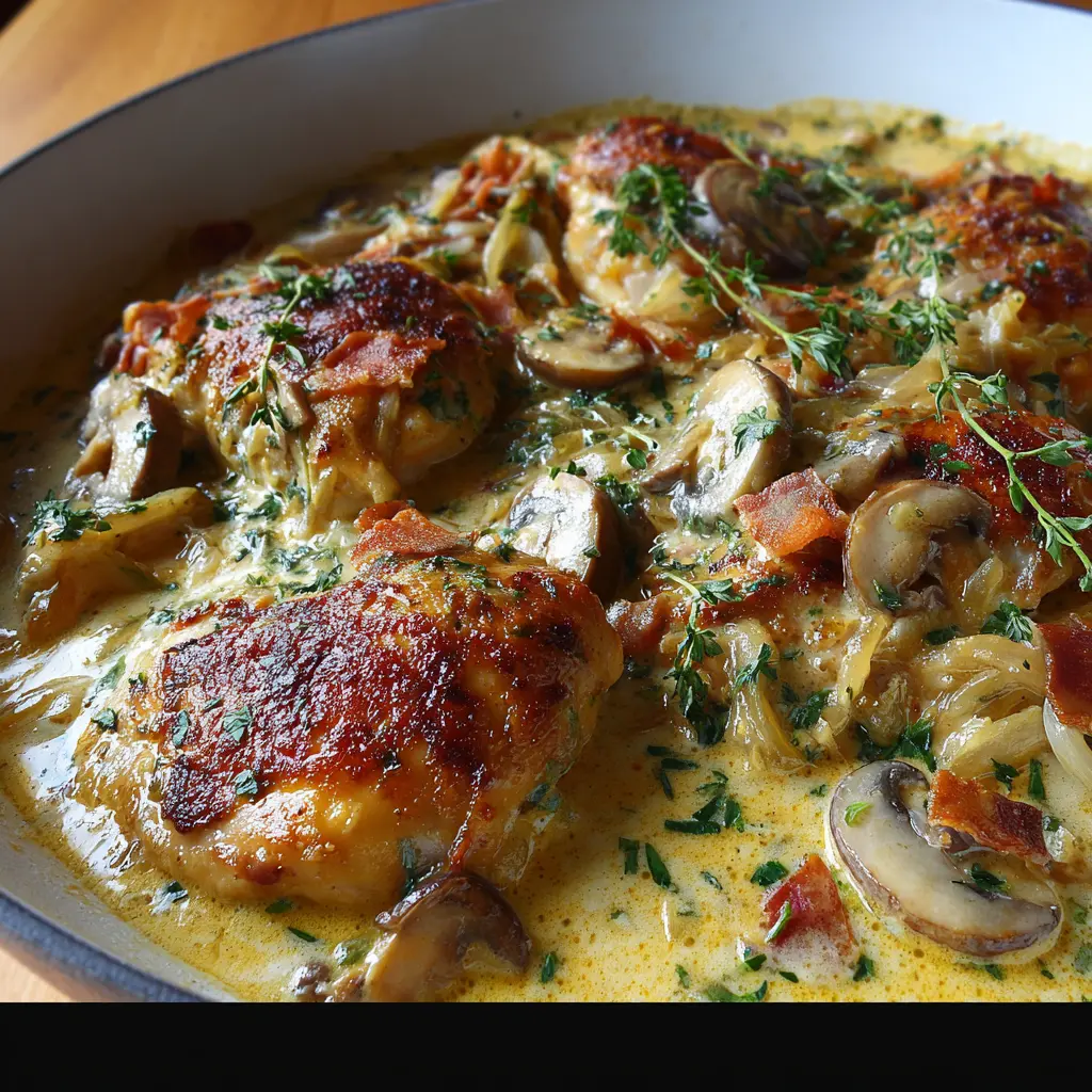 Enjoy a comforting and flavorful creamy French-style chicken casserole featuring turkey bacon for an extra delight!