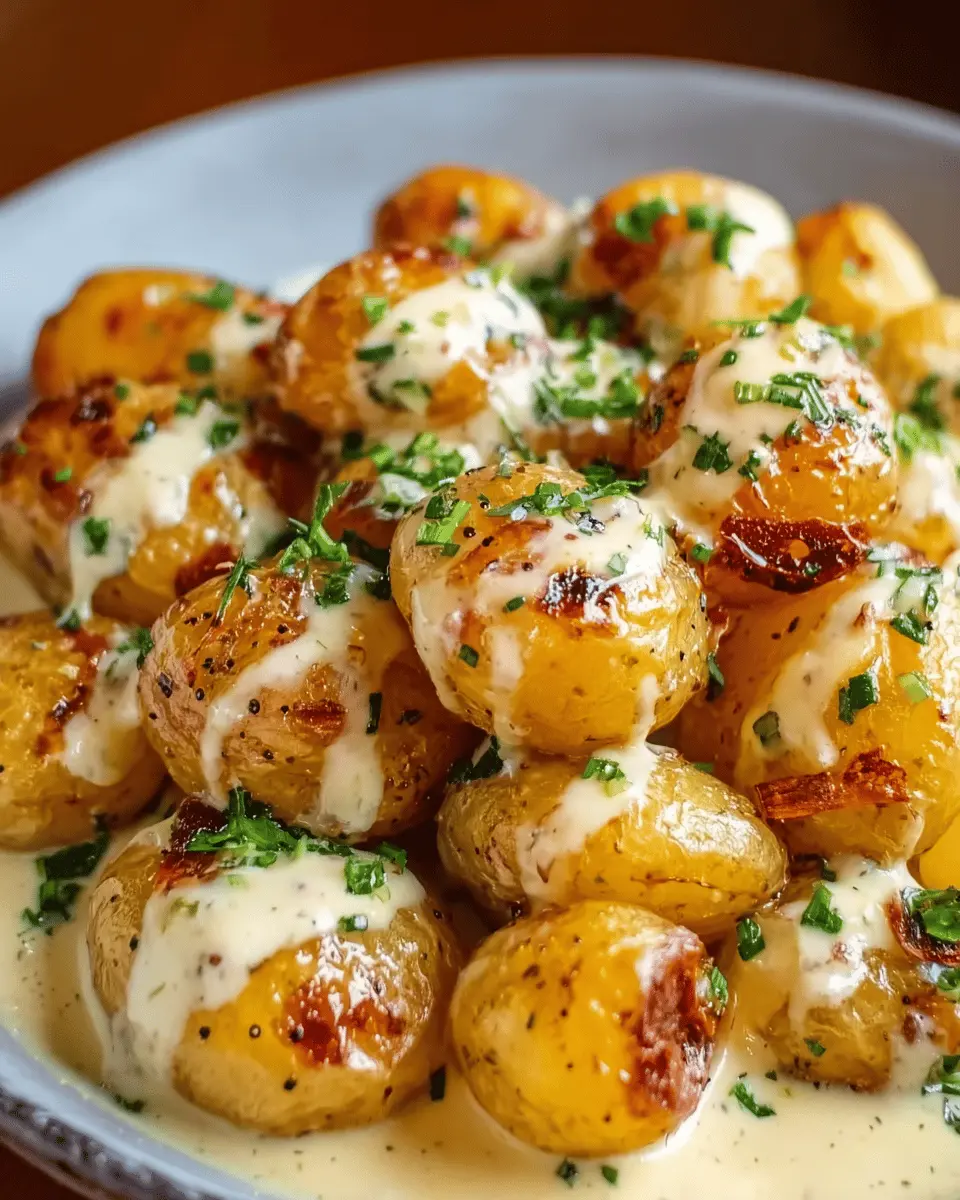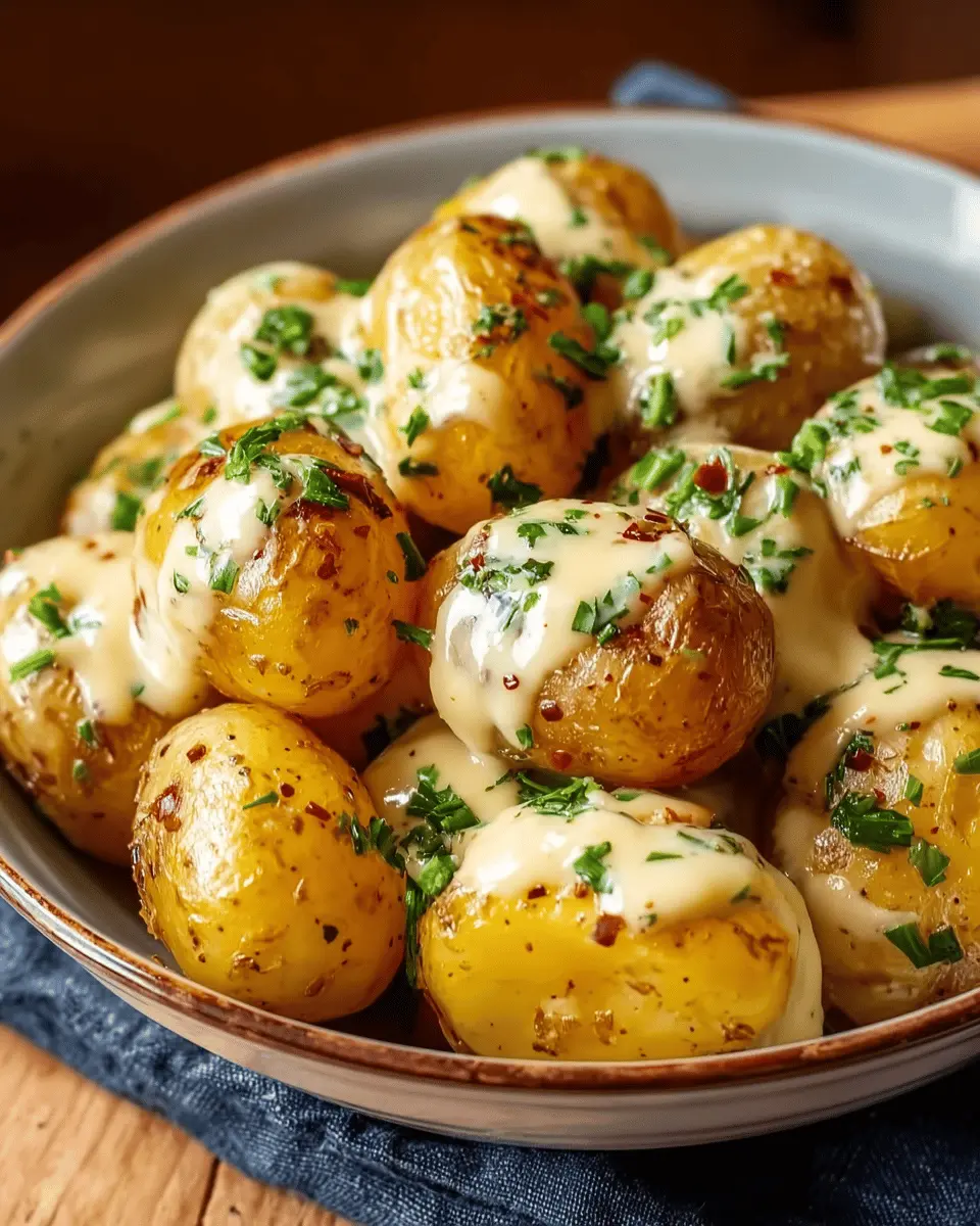 Creamy Garlic Sauce Baby Potatoes with Turkey Bacon Delight