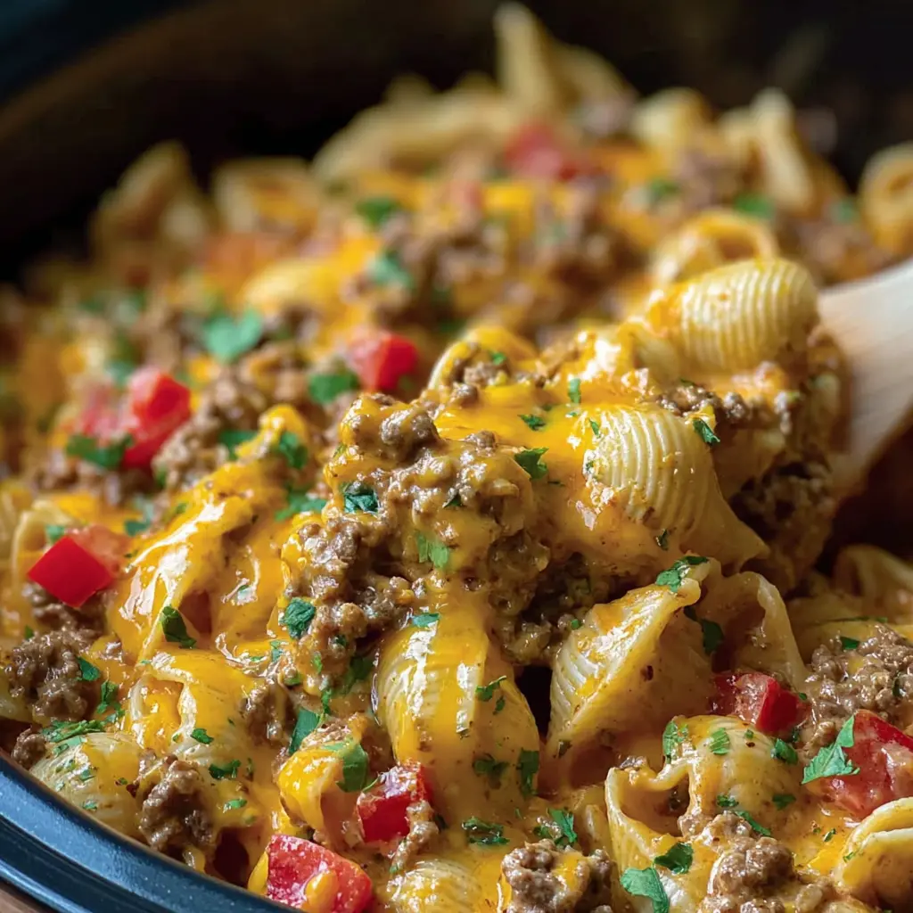 - Once cooked, drain the shells and gently fold them into the cheese and beef mixture in your crockpot.