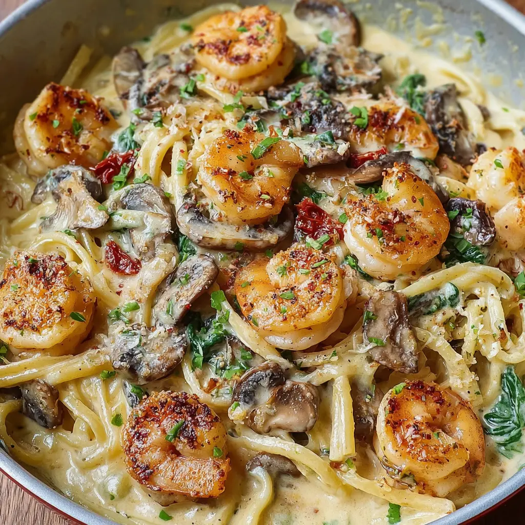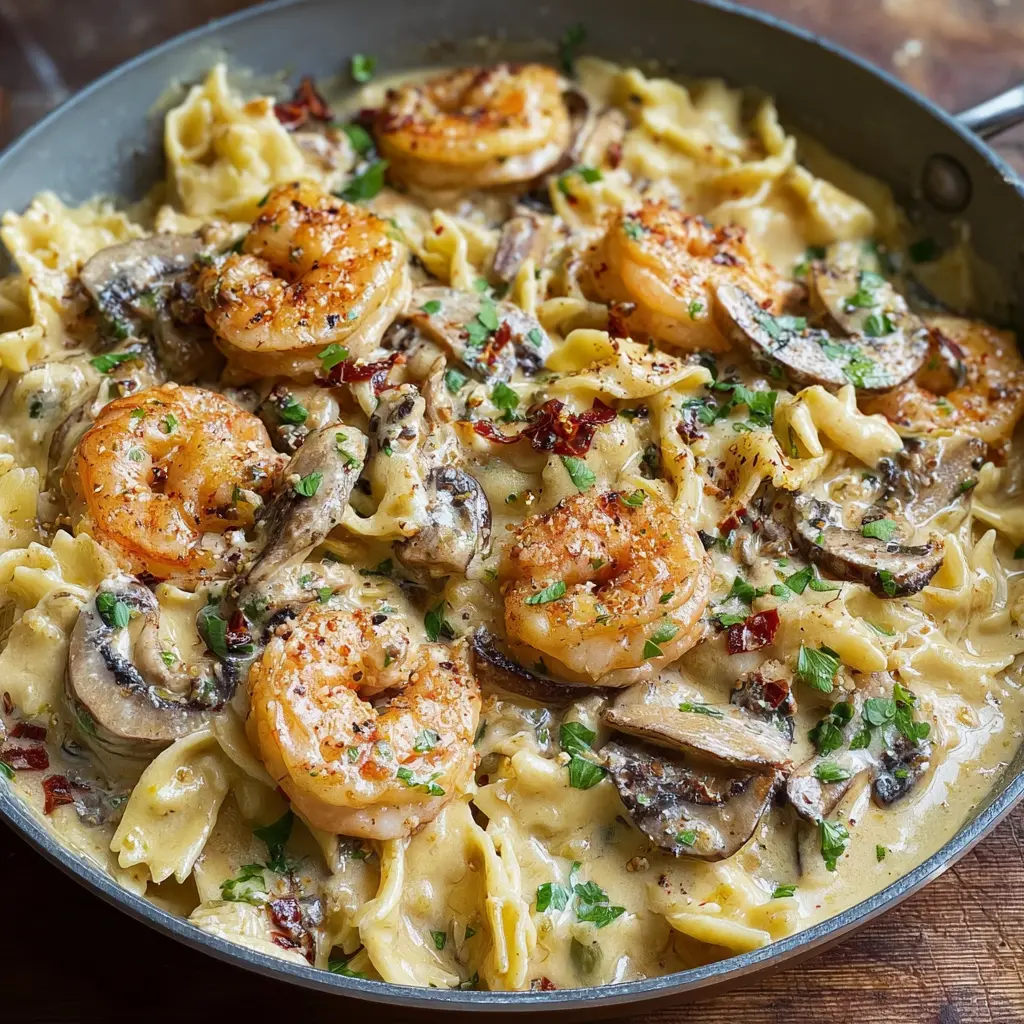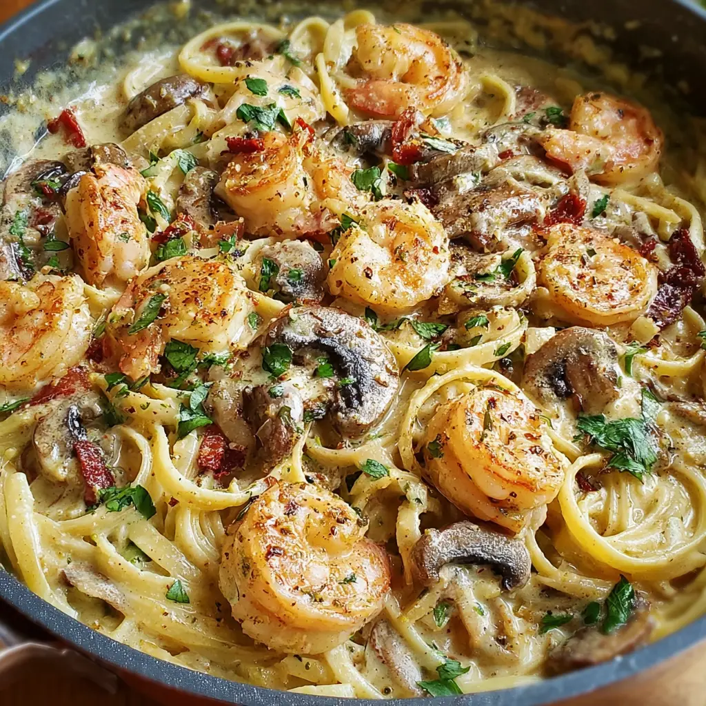 This Creamy Shrimp Pasta with Mushrooms is an indulgent dish that combines the rich flavors of shrimp, mushrooms, and turkey bacon for a delightful meal.