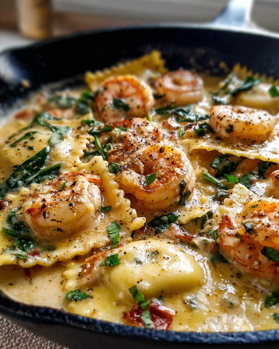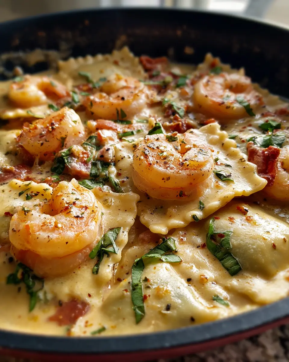 A rich and creamy dish featuring shrimp and ravioli, perfect for a comforting meal.