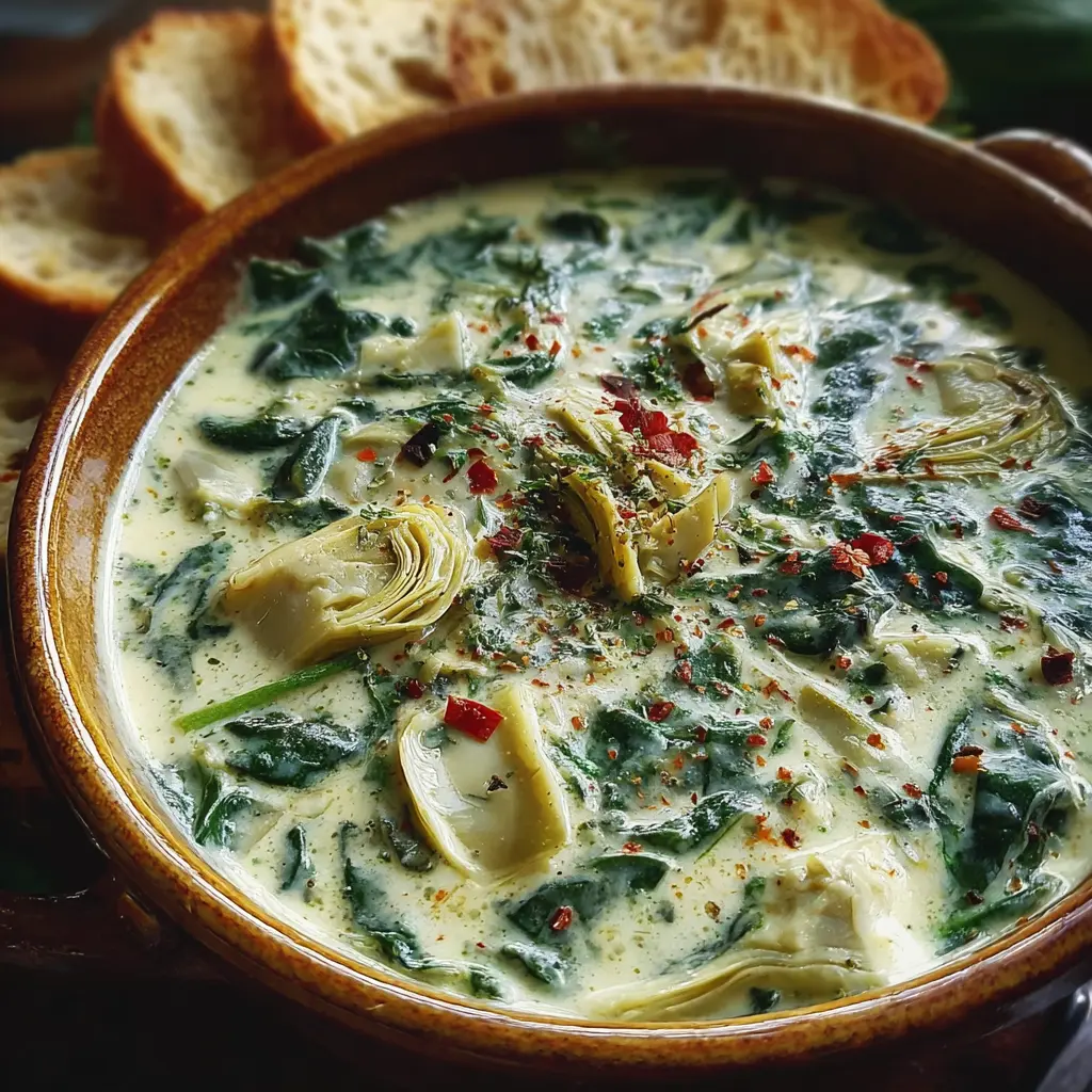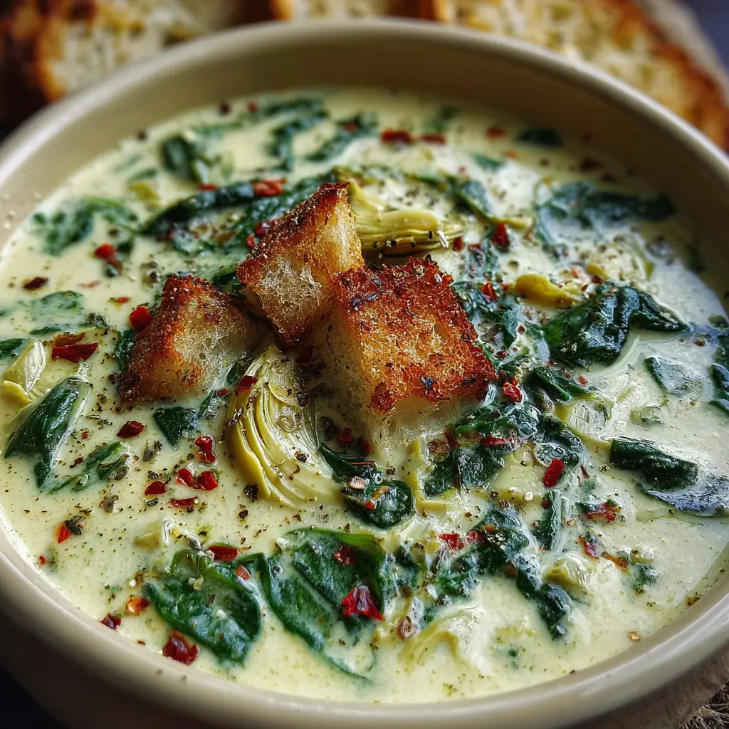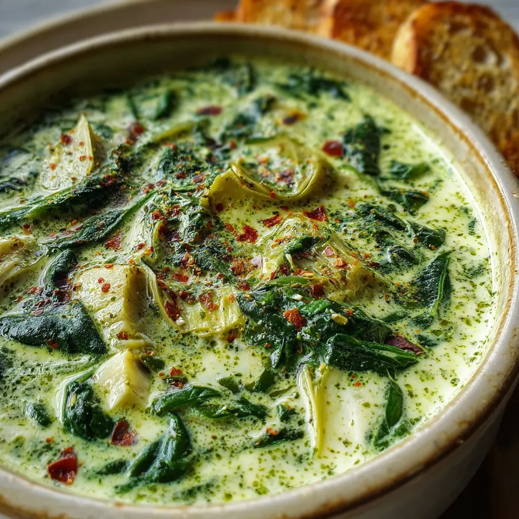 A delicious and creamy spinach artichoke soup packed with flavor, perfect for a cozy meal.