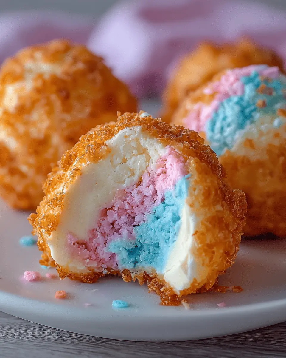 Crispy Cotton Candy Cheesecake Bombs are a delightful dessert that combines the fluffy sweetness of cotton candy with the creamy richness of cheesecake, all wrapped in a crispy exterior.