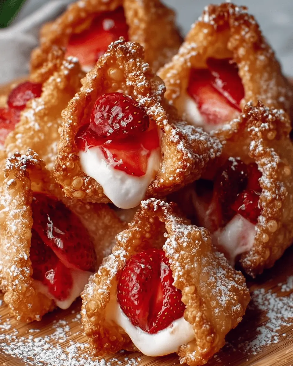 Enjoy a deliciously indulgent treat with these Deep-Fried Strawberry Cheesecake Wonton Bites, perfect for any dessert lover.