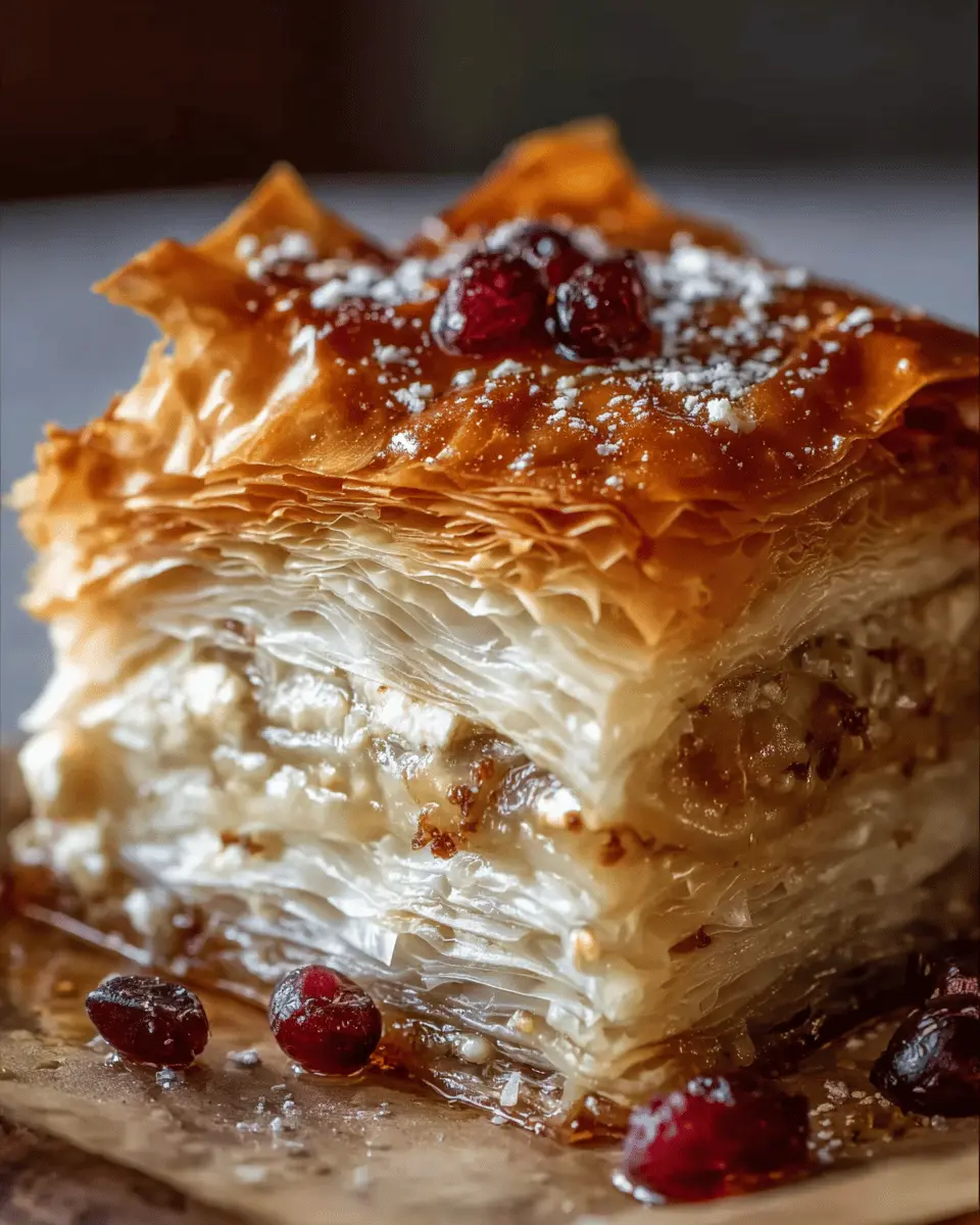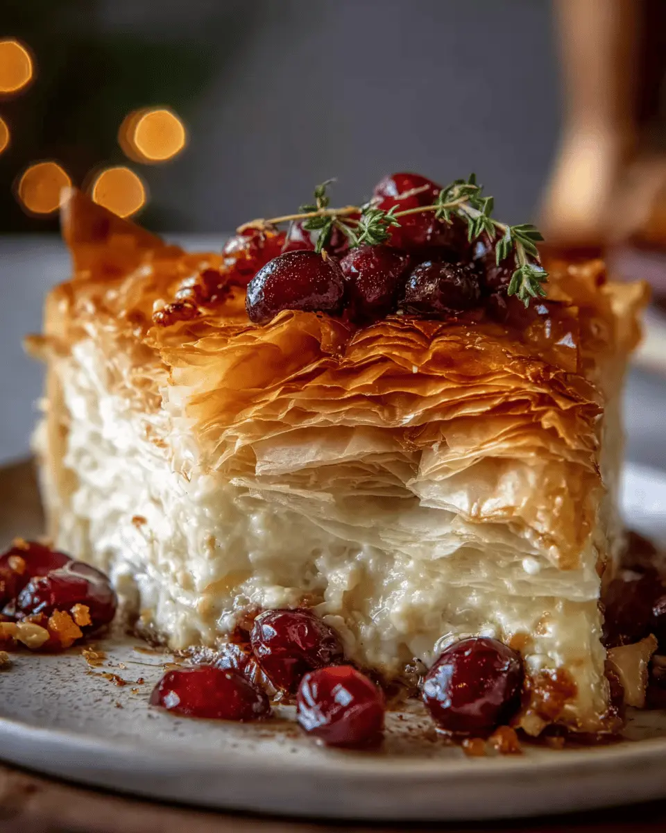A delicious appetizer made with layers of flaky phyllo dough and creamy brie cheese, perfect for holiday gatherings.