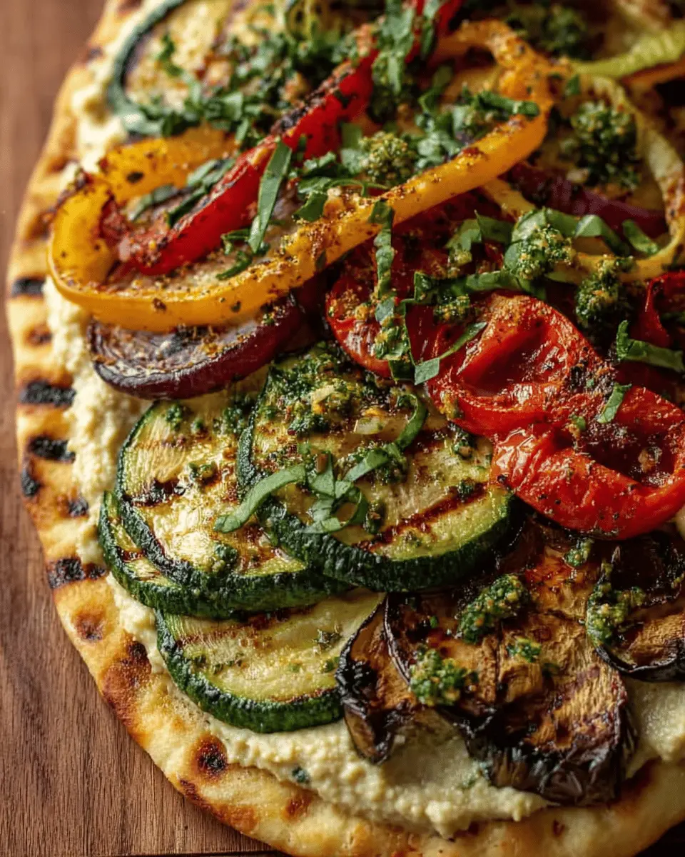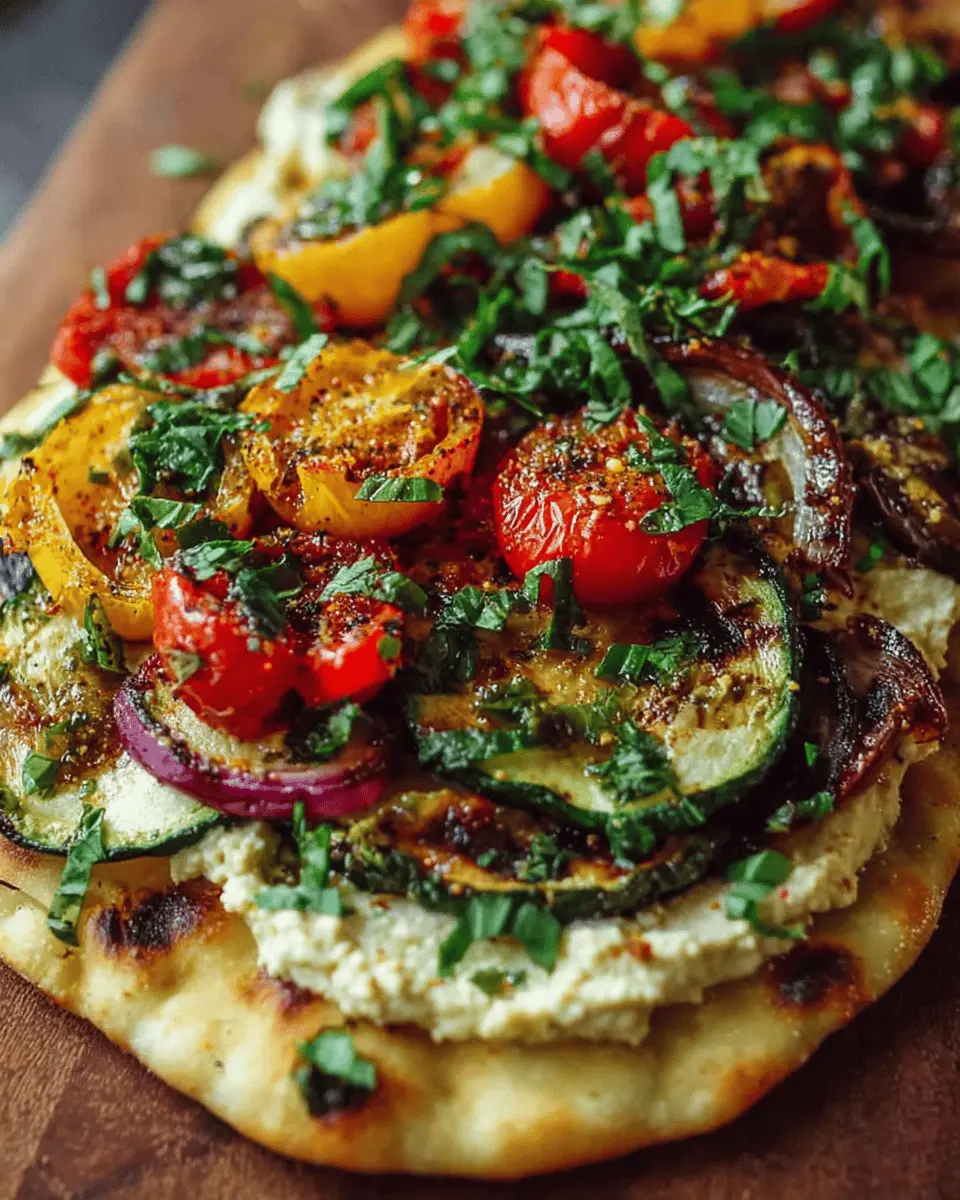Flatbread with Hummus: Easy Grilled Veggies and Fresh Herbs Delight