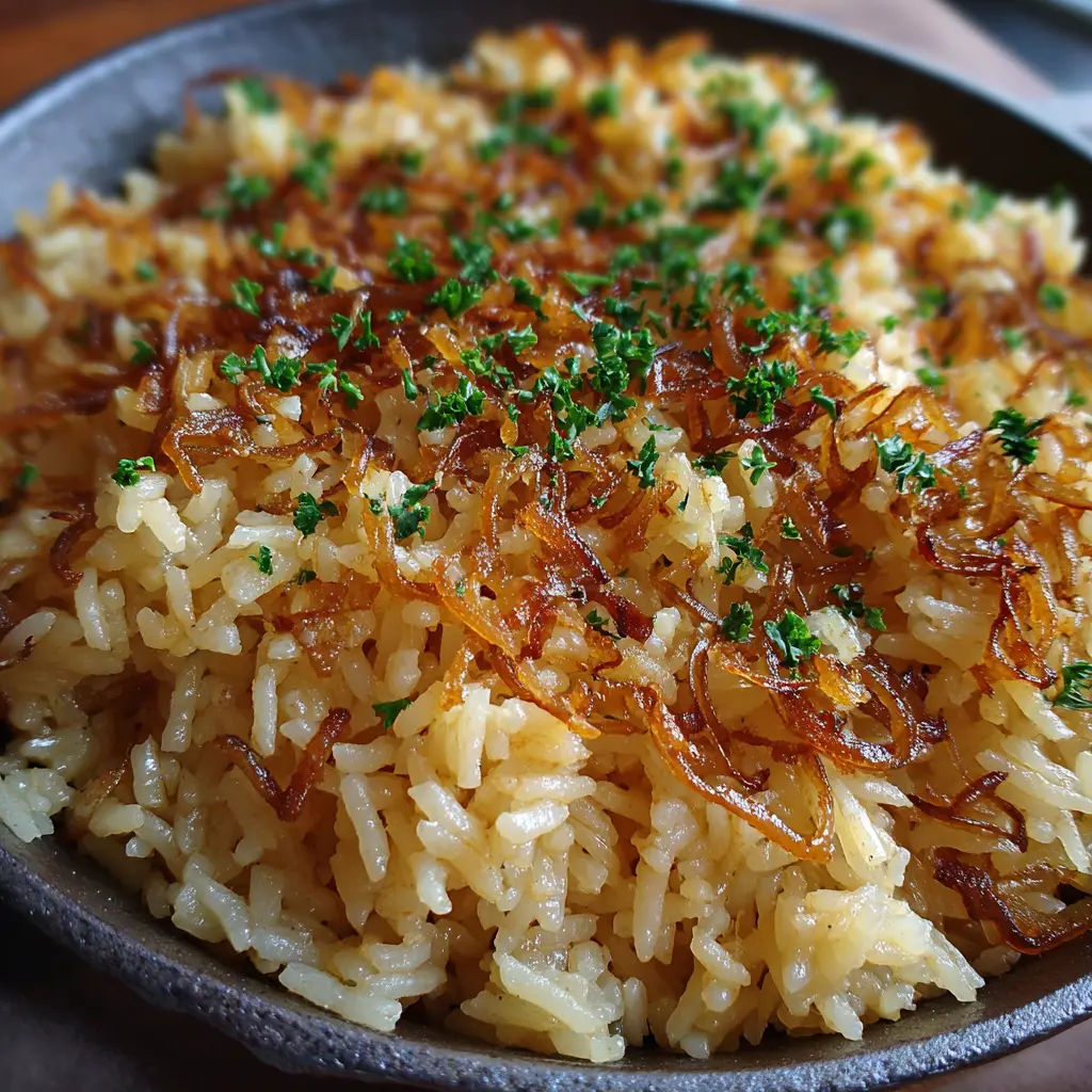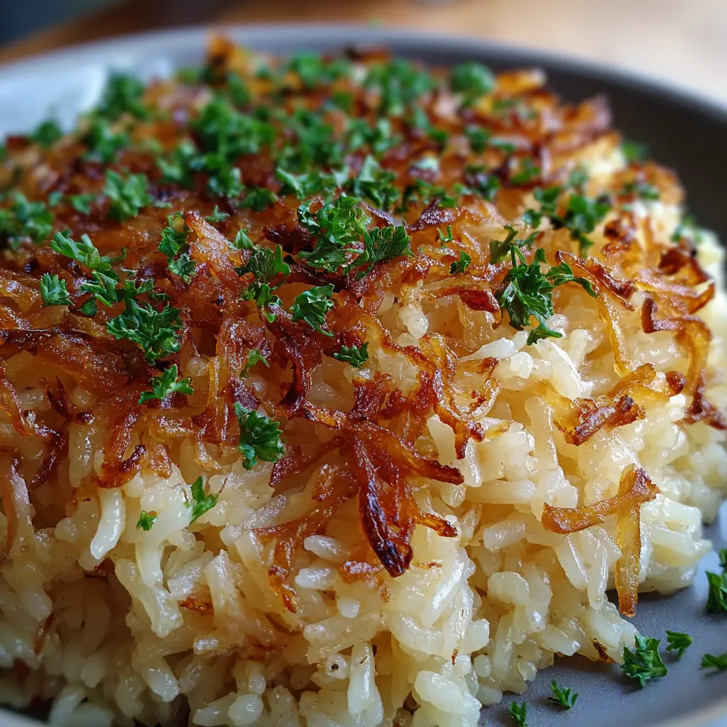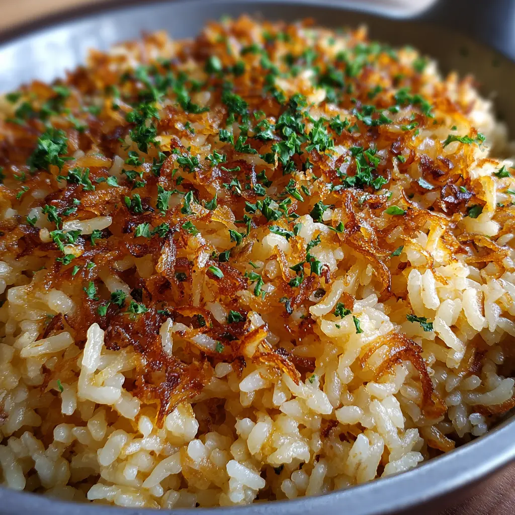 For a plant-based twist, you can easily convert this recipe into a vegan delight. Substitute the butter with a high-quality vegan butter and use vegetable broth instead of chicken broth. You could toss in some sautéed mushrooms and caramelized onions for that umami flavor that’s often missing in vegan dishes. You can even add a handful of fresh herbs like thyme or rosemary for that extra pop of flavor. This vegan French Onion Butter Rice not only satisfies your taste buds but is also a go-to for anyone looking to cut down on animal products without sacrificing flavor or satisfaction.