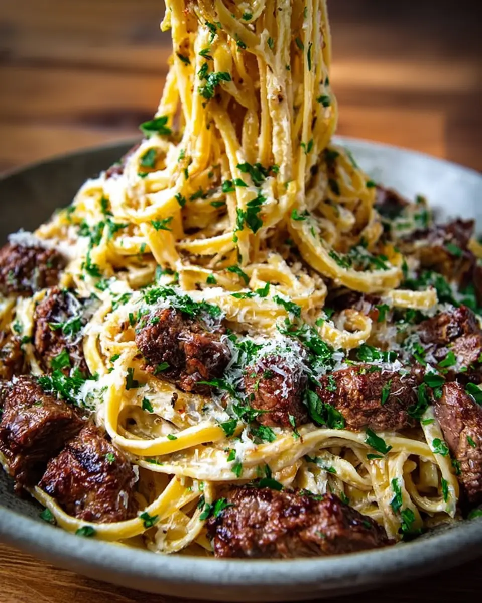 Indulge in a rich and creamy Garlic Butter Beef Linguine, bursting with flavor from the parmesan cream sauce.