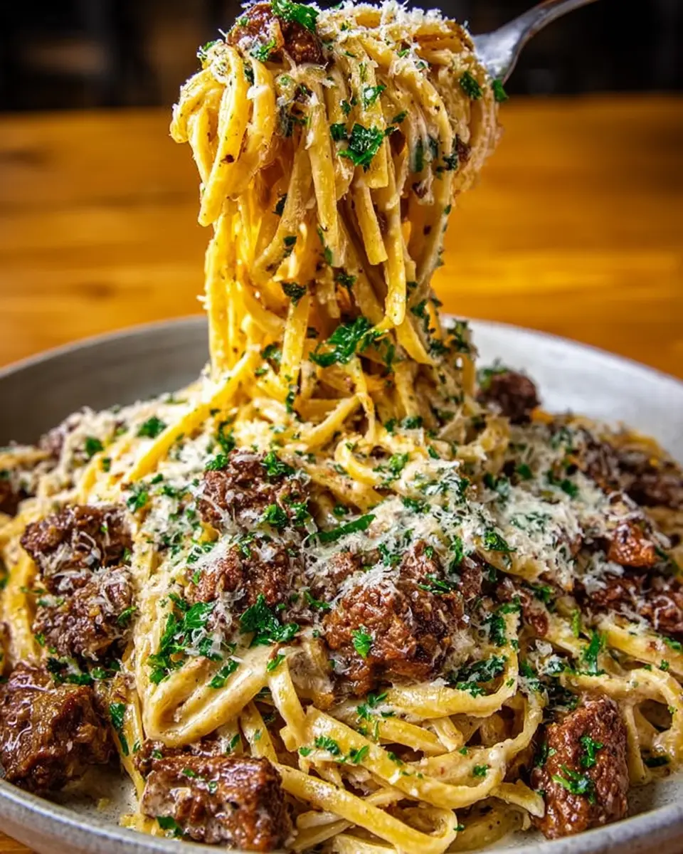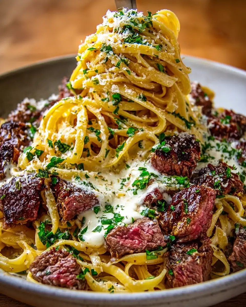 Garlic Butter Beef Linguine: A Juicy Parmesan Cream Delight