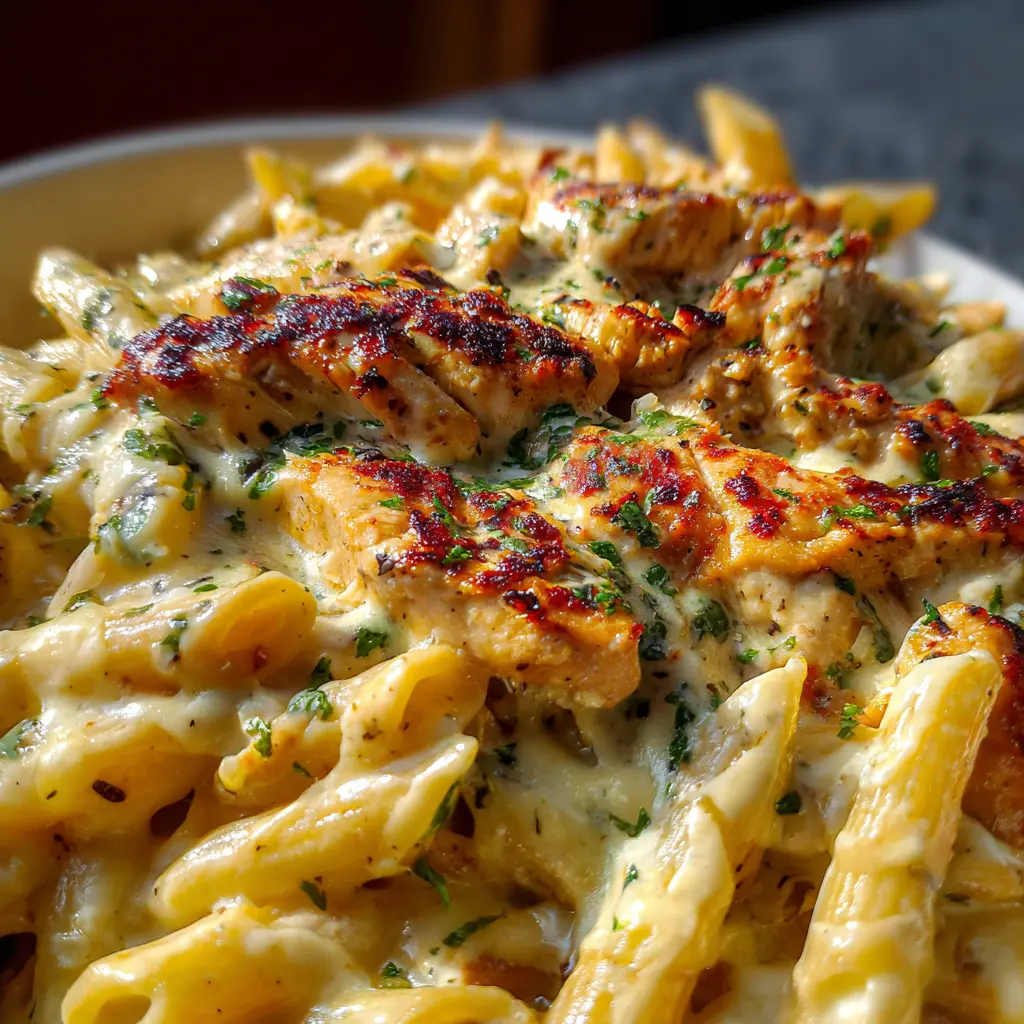 A deliciously creamy and cheesy pasta dish featuring garlic butter chicken and penne, topped with mozzarella alfredo sauce.