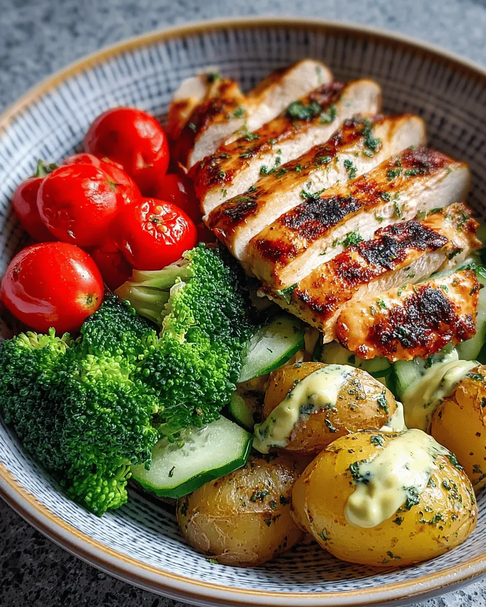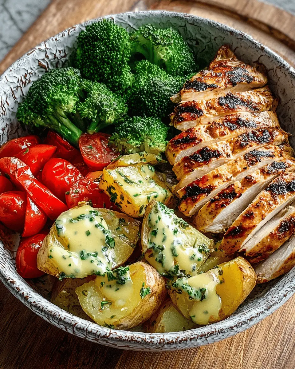 A delicious and easy recipe for a Grilled Chicken Bowl featuring herb potatoes, steamed broccoli, and fresh vegetables.