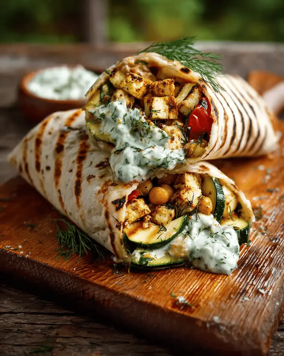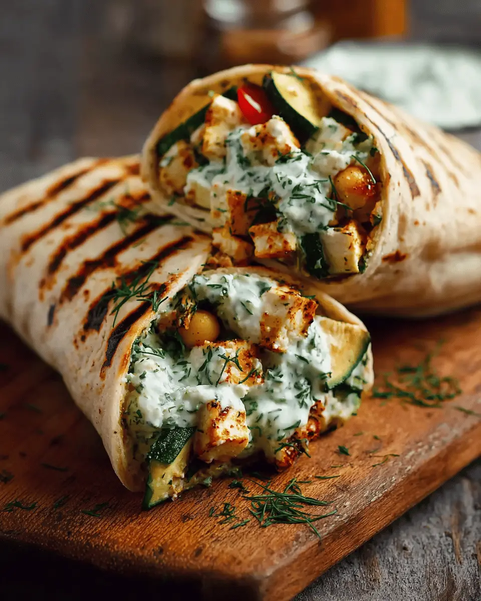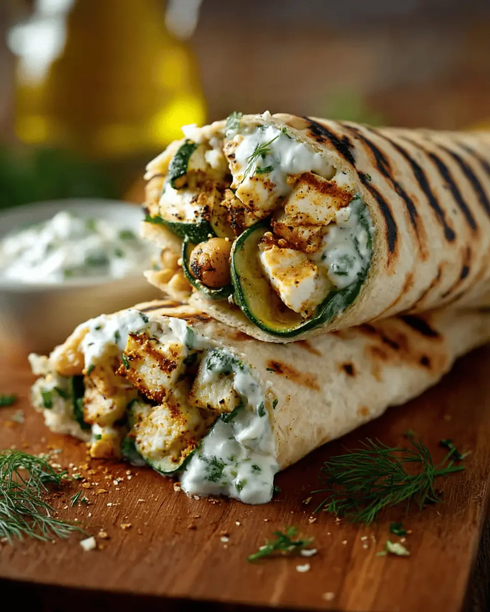 A delicious and refreshing wrap filled with grilled zucchini, feta cheese, chickpeas, and a herbed yogurt sauce.