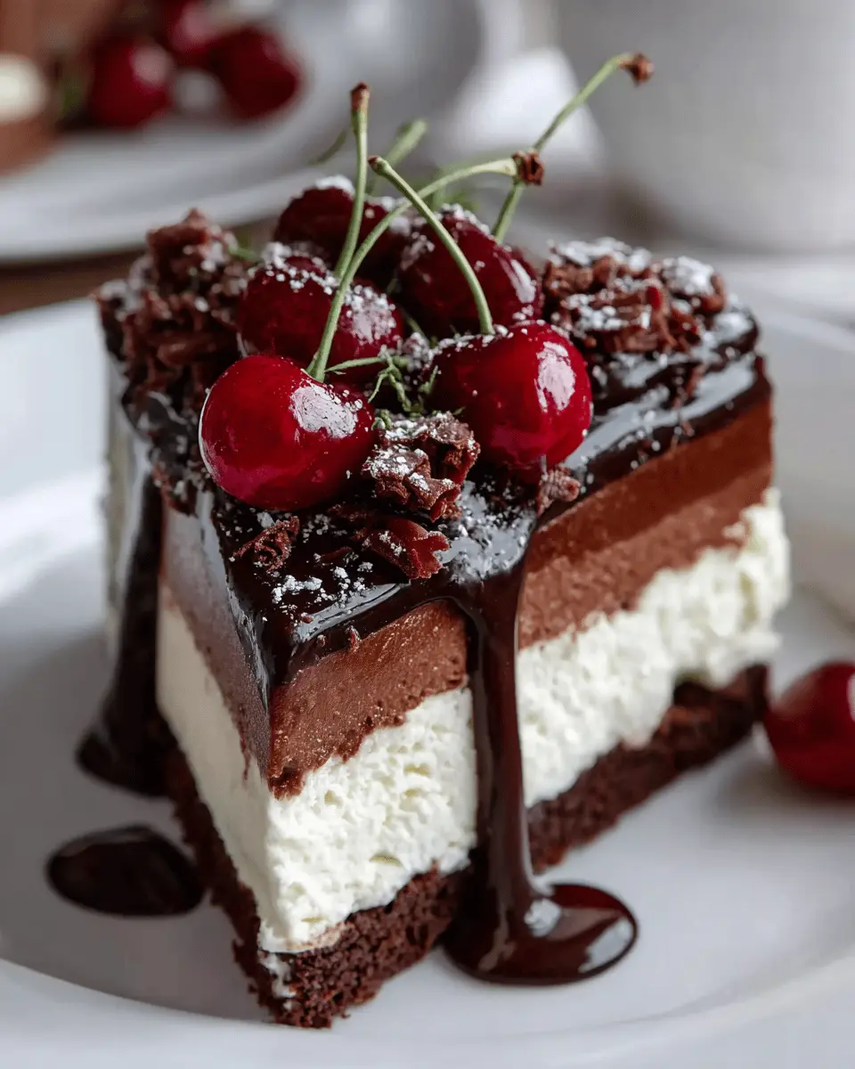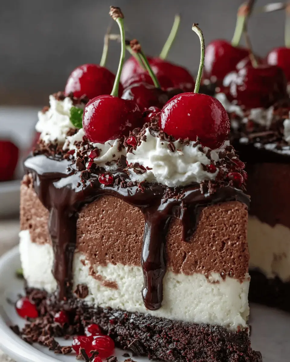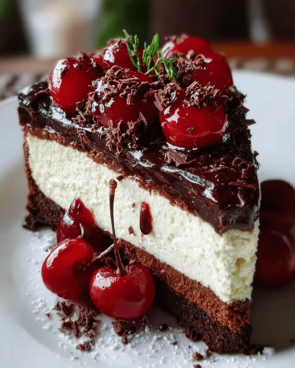 A rich and decadent dessert that combines the flavors of chocolate, cherries, and cream in a delightful cheesecake.