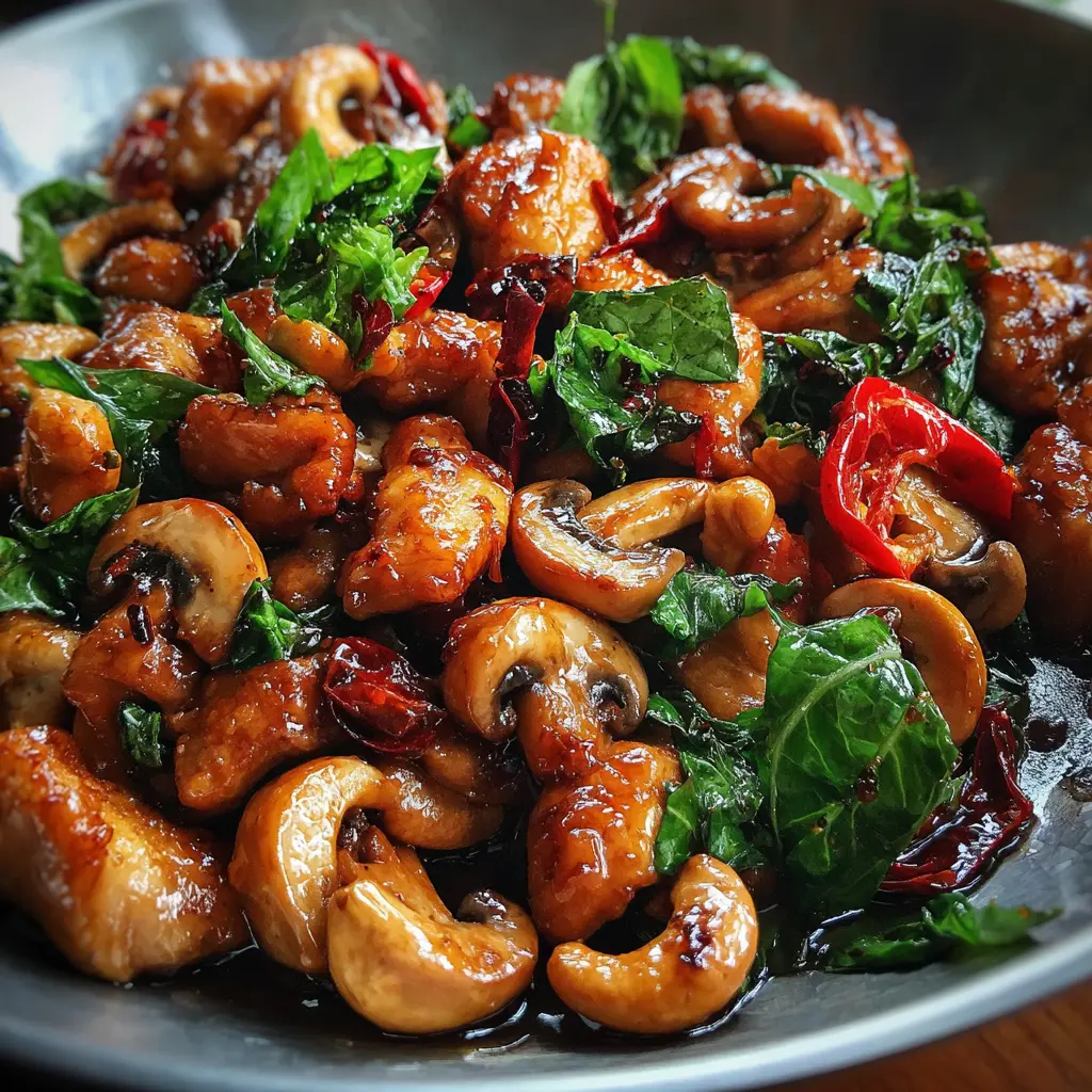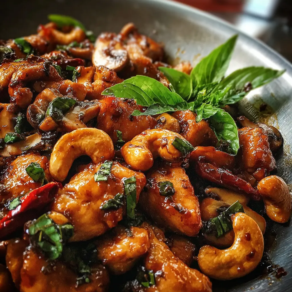 A delicious and easy weeknight meal featuring chicken, cashews, and mushrooms with a sweet basil sauce.