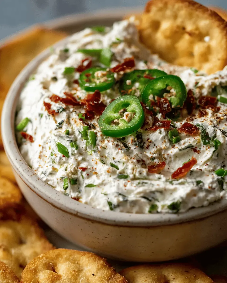 Delve into the creamy goodness of Jalapeño Cream Cheese Dip, perfectly spiced and enhanced with turkey bacon, making it an ideal addition to any platter.