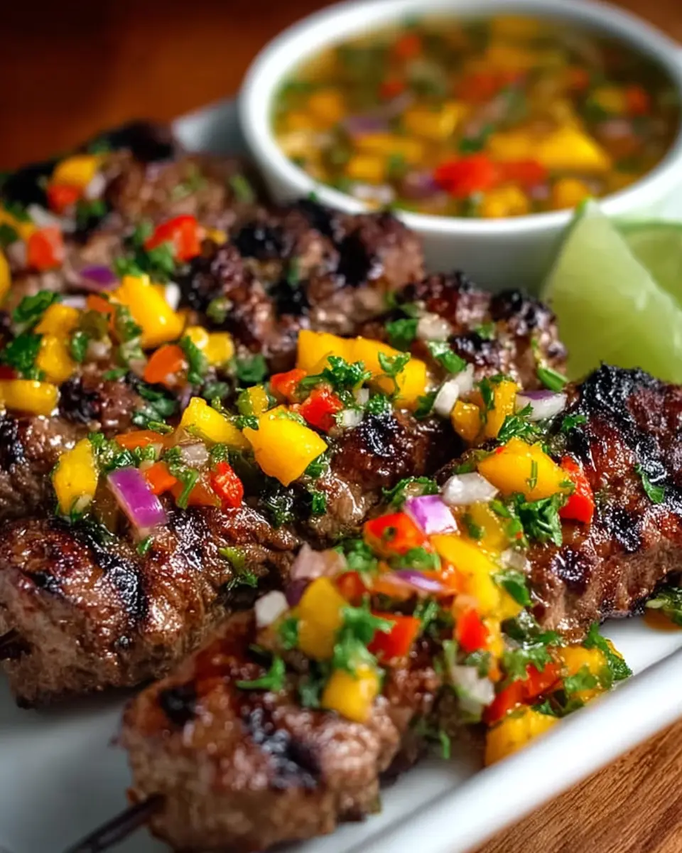 Delicious Jamaican Jerk Beef Skewers paired with vibrant mango salsa for a perfect summer dish.