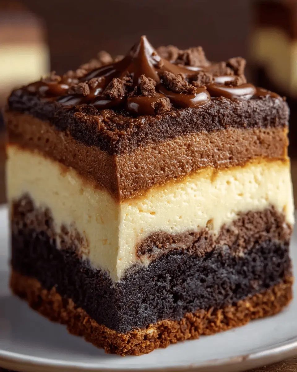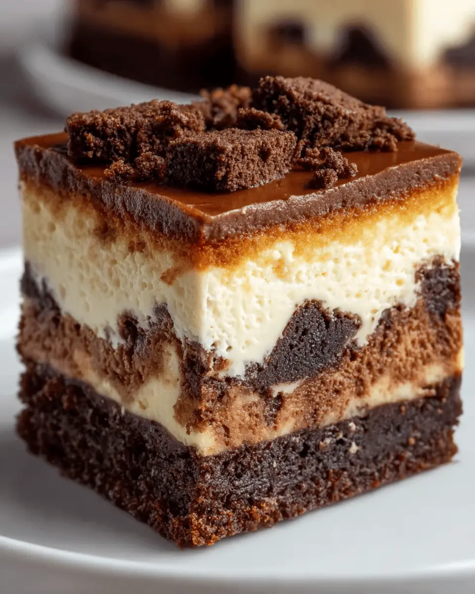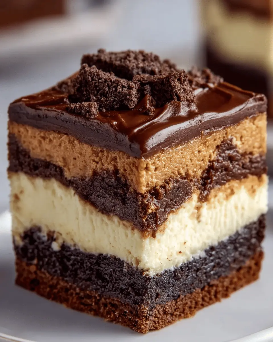 A delicious treat that combines layers of cookie, brownie, and cheesecake for a delightful indulgence.