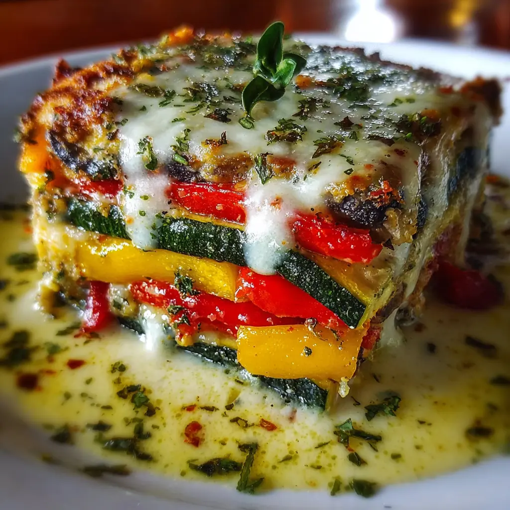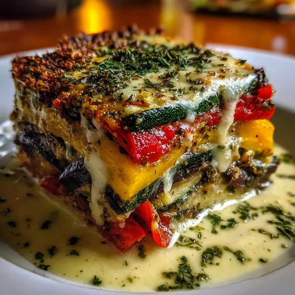 Experience the rich flavors of Mediterranean vegetables in this delicious layered lasagna, drizzled with a creamy garlic herb three-cheese sauce.