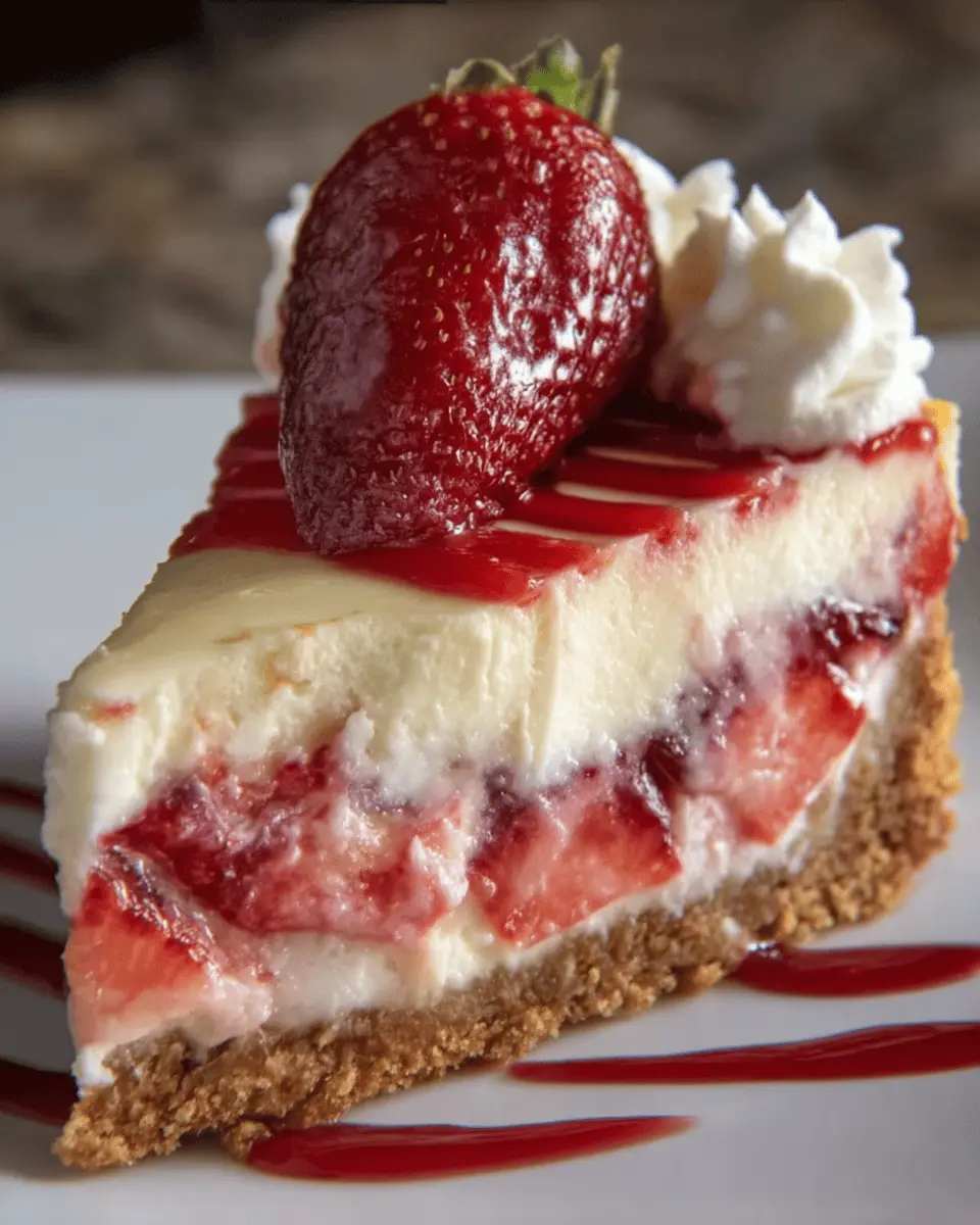 Slice it up and watch as your guests marvel at the layers of creamy cheesecake and vibrant strawberries. Serve chilled, perhaps with a dollop of whipped cream for extra indulgence.