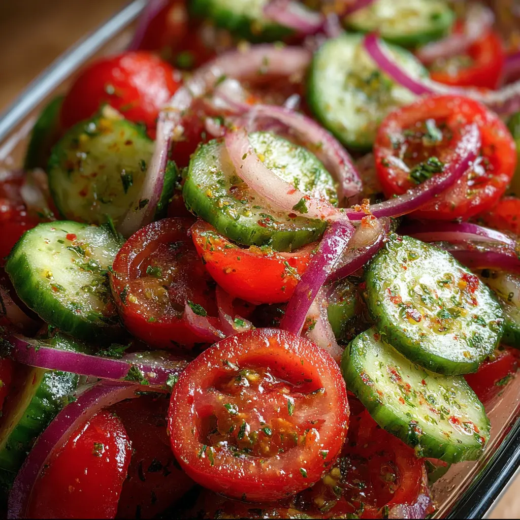 Enhance your meals with this refreshing combination of marinated cucumbers, onions, and tomatoes. Perfect as a side dish or salad, this recipe brings a burst of flavor to any table.