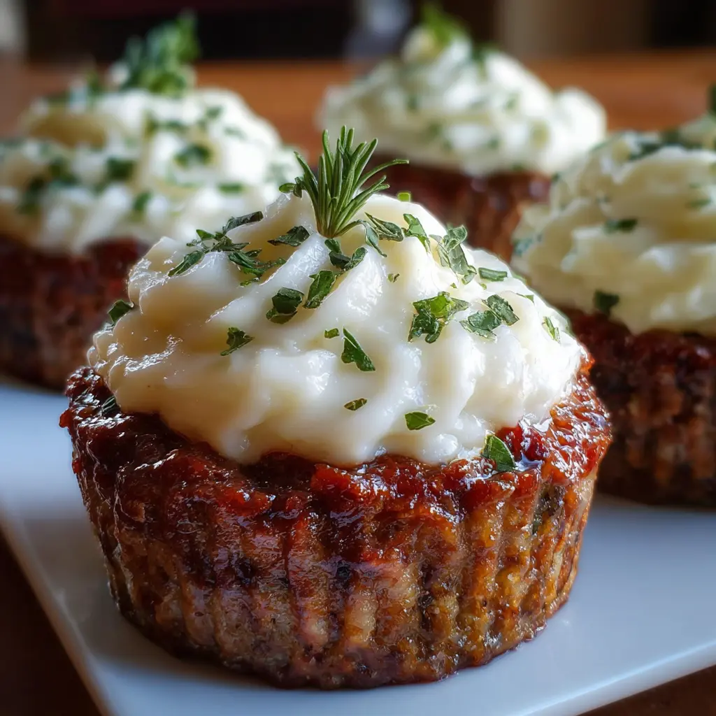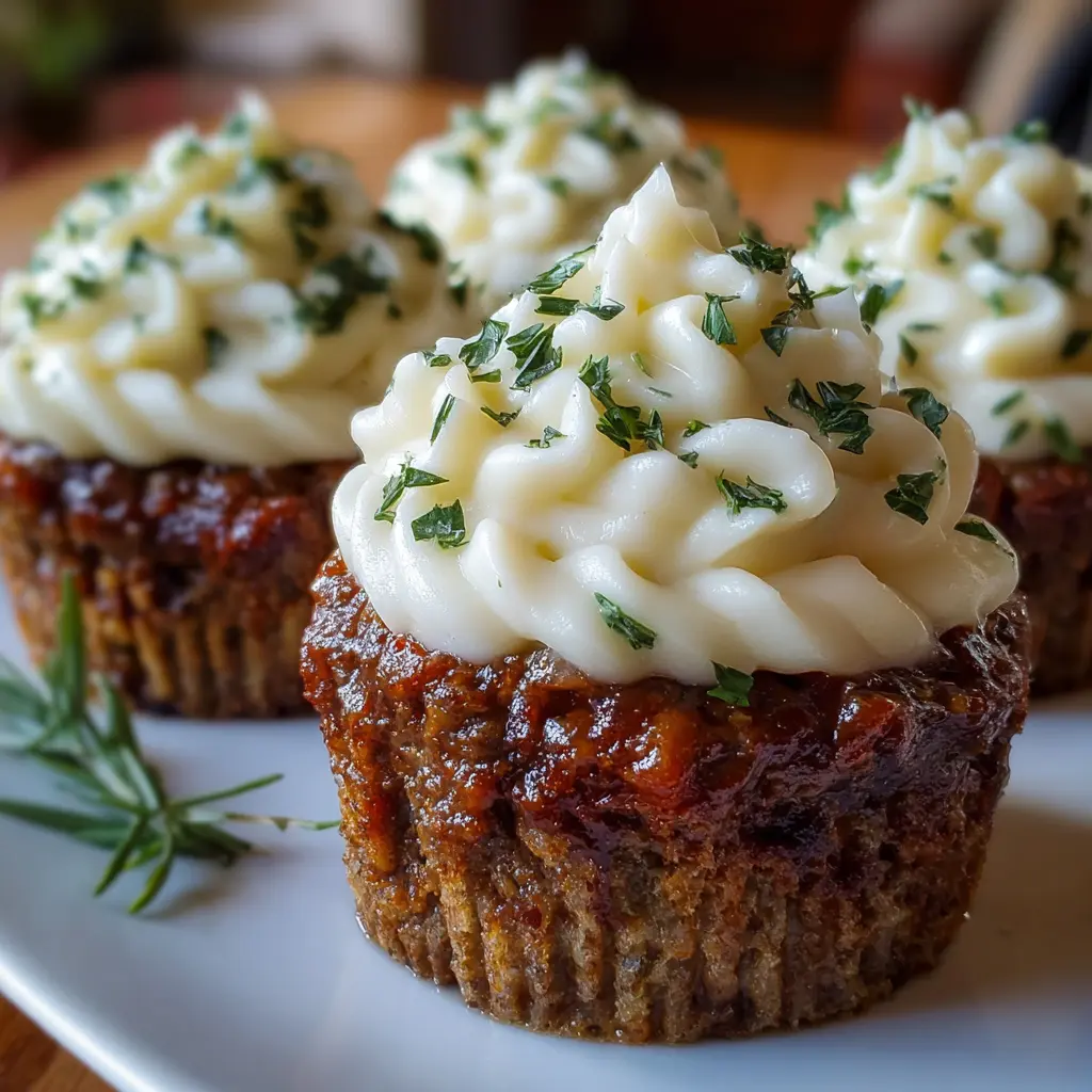 Enjoy these delicious Meatloaf Cupcakes topped with creamy whipped potatoes, perfect for a fun twist on a classic dish.