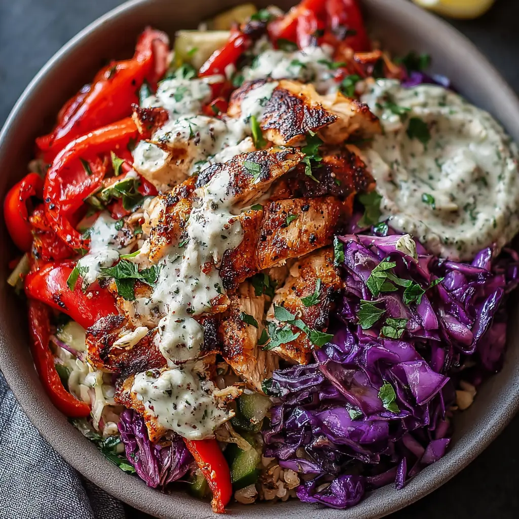 No Mediterranean Chicken Bowl is complete without a tasty dressing, and this ginger tahini version is a standout! In a small bowl, mix the tahini, freshly grated ginger, and enough water to create a smooth, pourable consistency. Season with salt and a splash of lemon juice for added brightness. This dressing not only ties the flavors together but also offers a creamy element that balances the crunch of the cabbage.