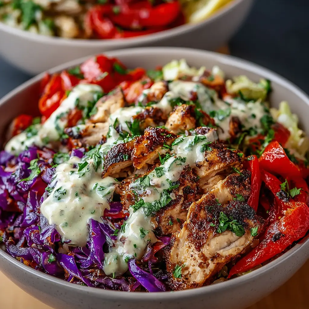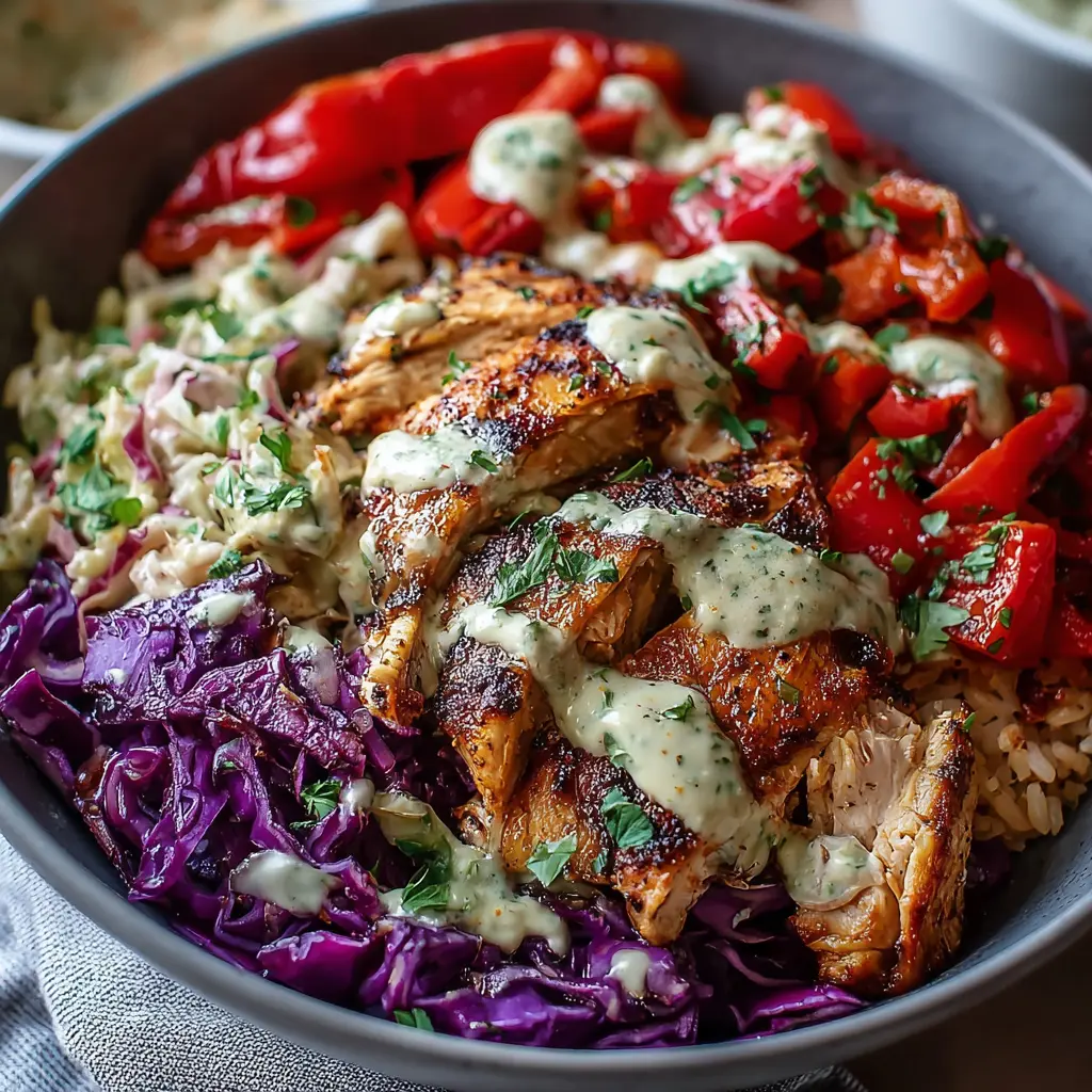 Once everything is ready, it’s time to assemble your Mediterranean Chicken Bowls. Slice the roasted chicken into strips and layer it in a bowl. Add a generous scoop of sautéed cabbage and roasted bell peppers. The layering of flavors will make each bite delicious.