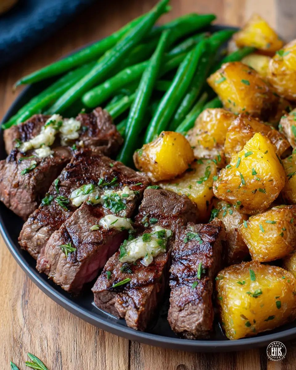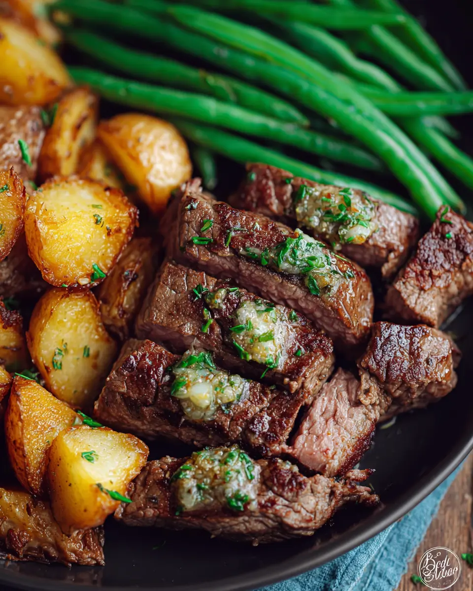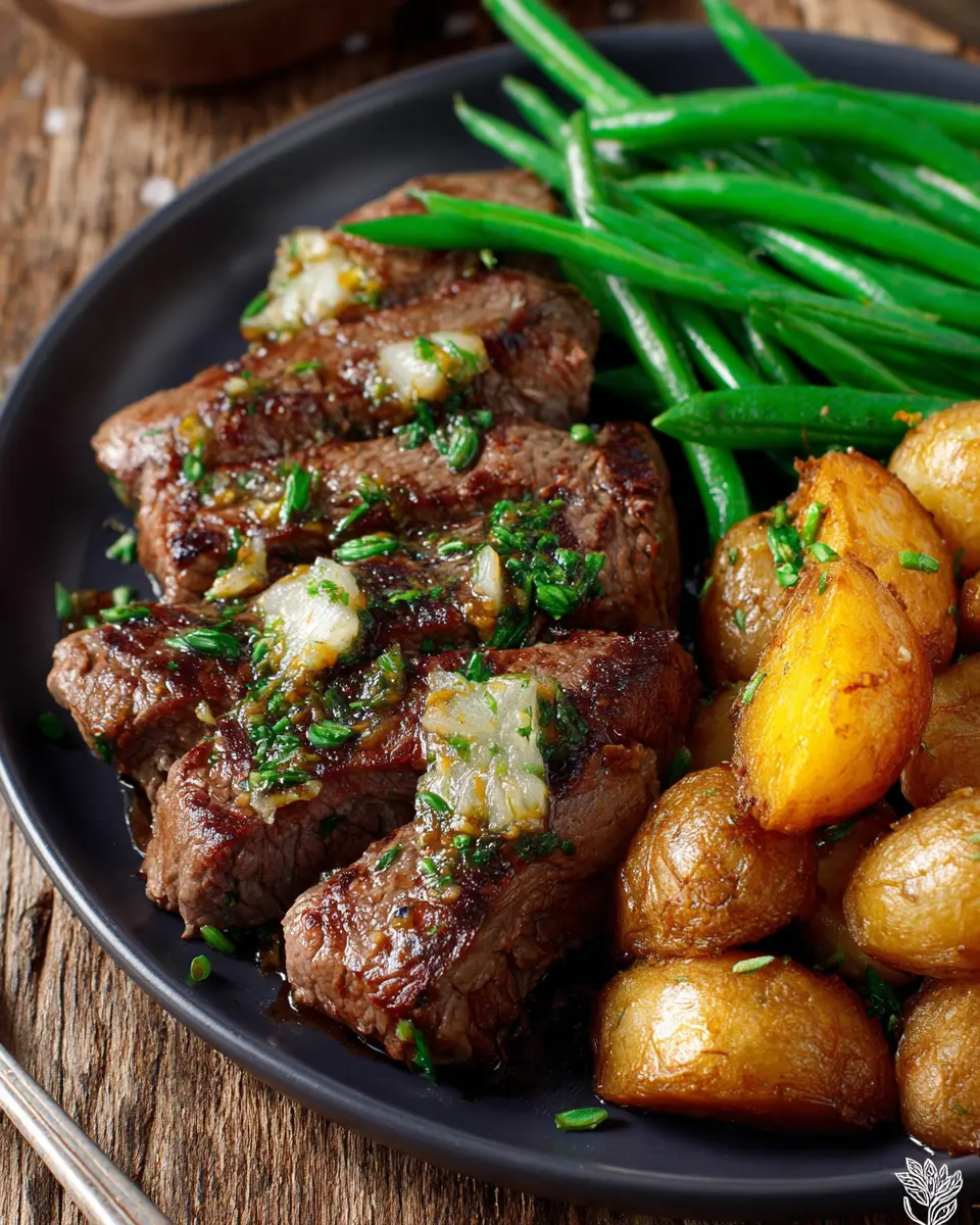 Indulge in a rich and flavorful Pan-Seared Steak with Garlic Butter, perfectly paired with Herb Potatoes and Green Beans for a delightful meal.