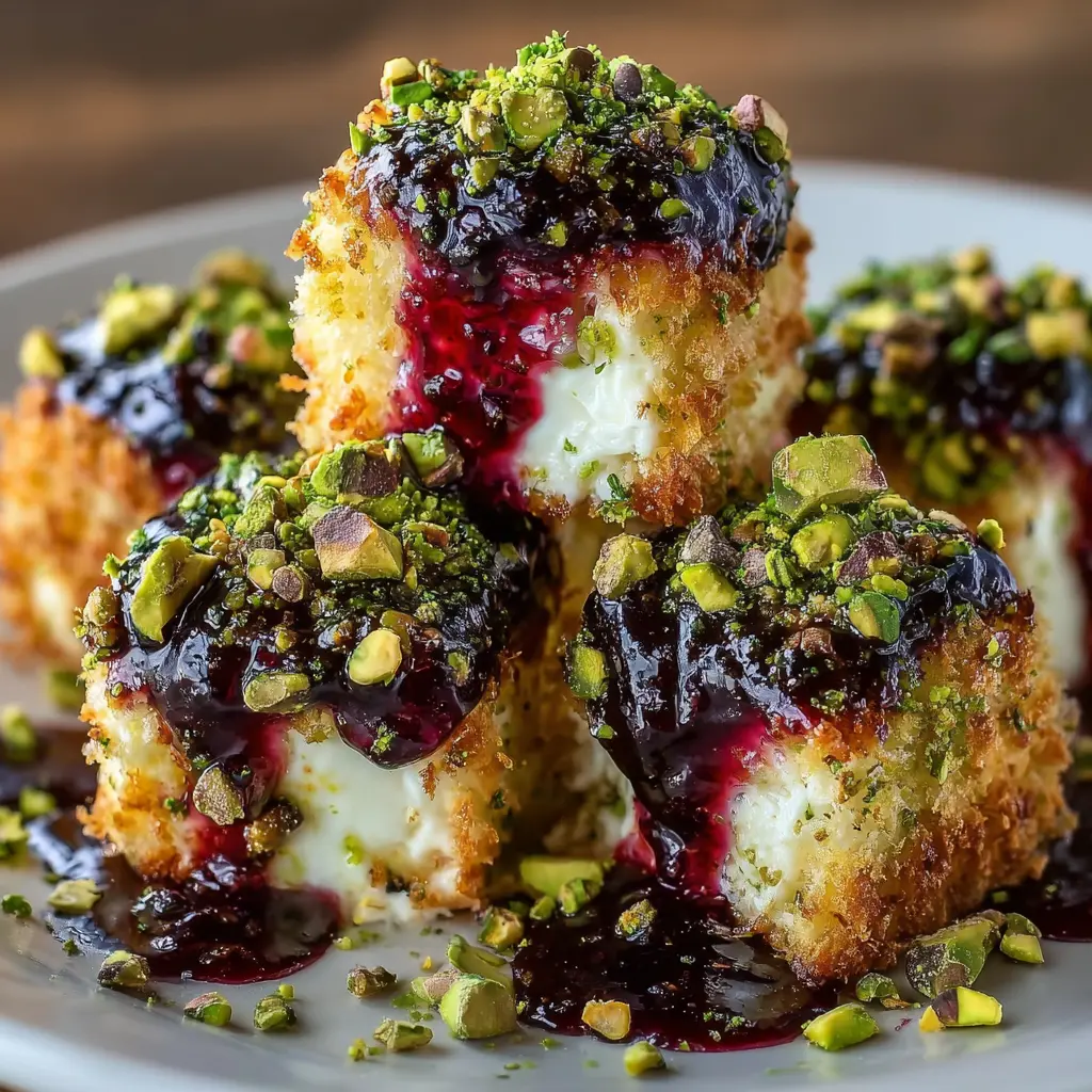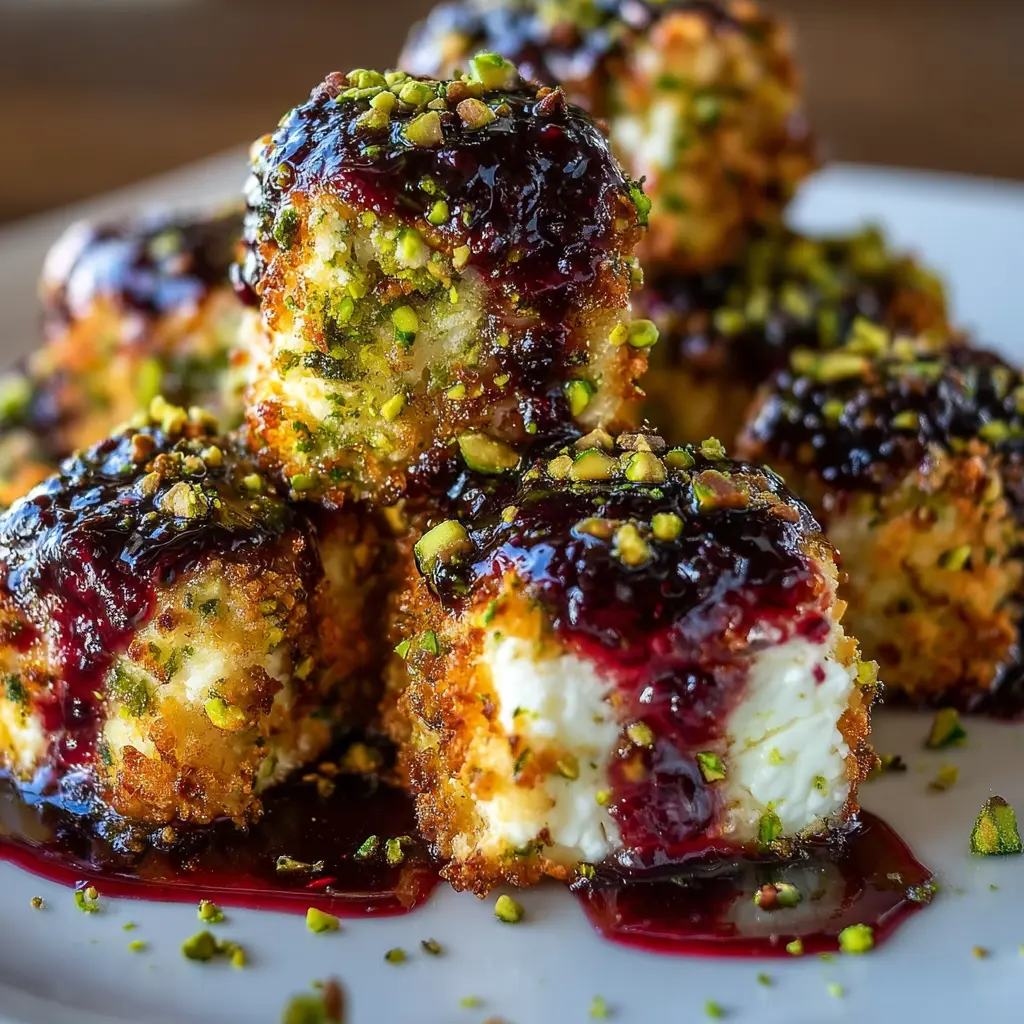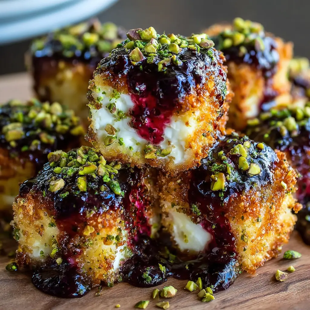 These Pistachio-Crusted Feta Bites are a delectable appetizer that beautifully combines creamy feta cheese with a crunchy pistachio coating, topped off with a sweet blackberry honey glaze.