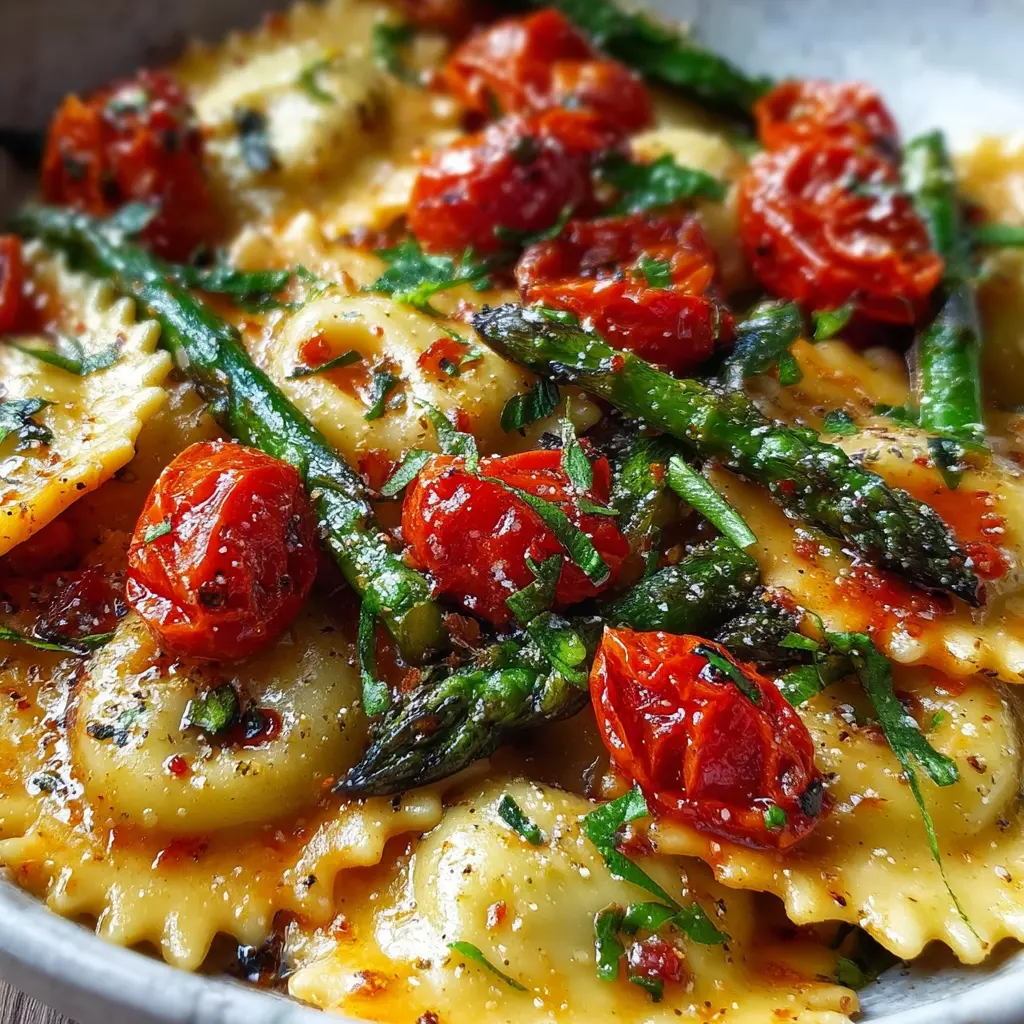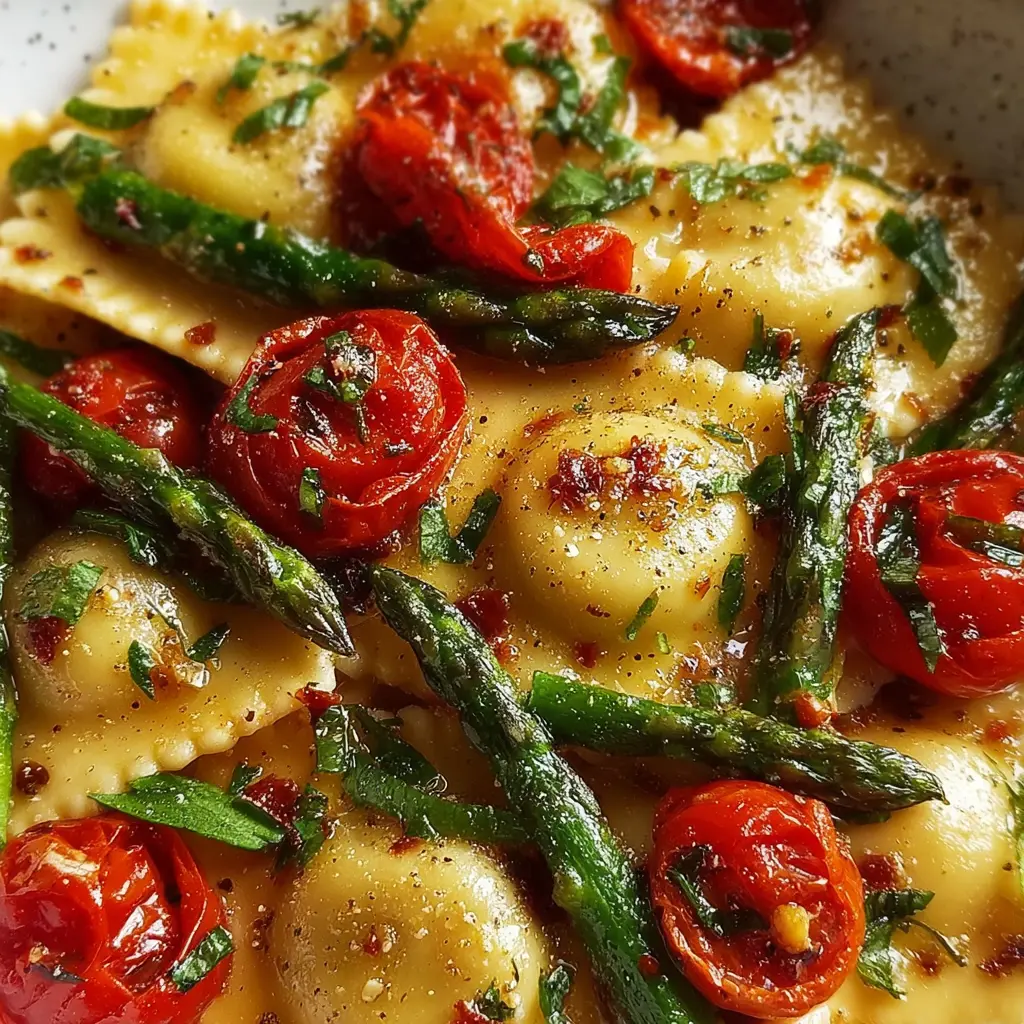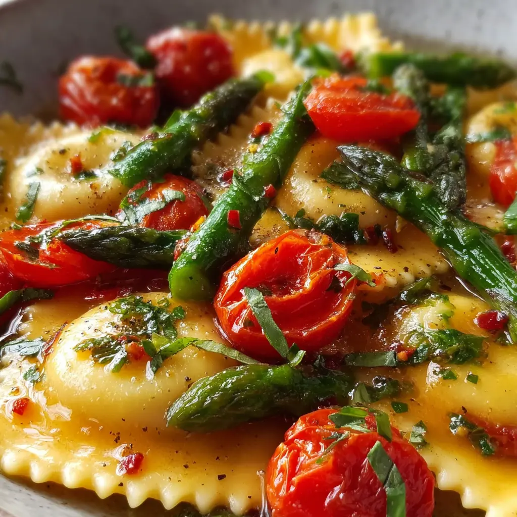 This delicious ravioli recipe features fresh tomatoes, asparagus, garlic, and a blend of herbs, perfect for a quick and easy meal.