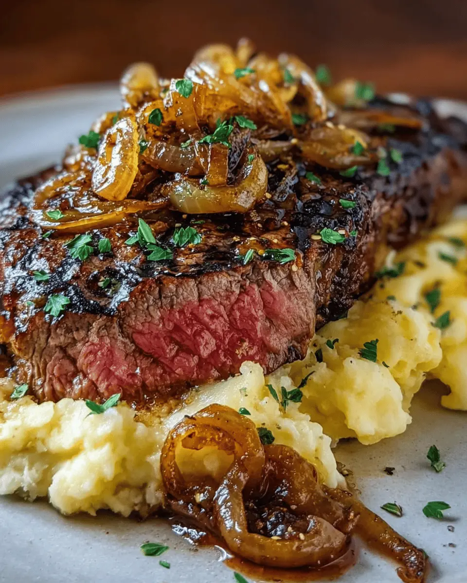 This ribeye steak recipe features juicy steak topped with caramelized onions, served alongside creamy mashed potatoes.