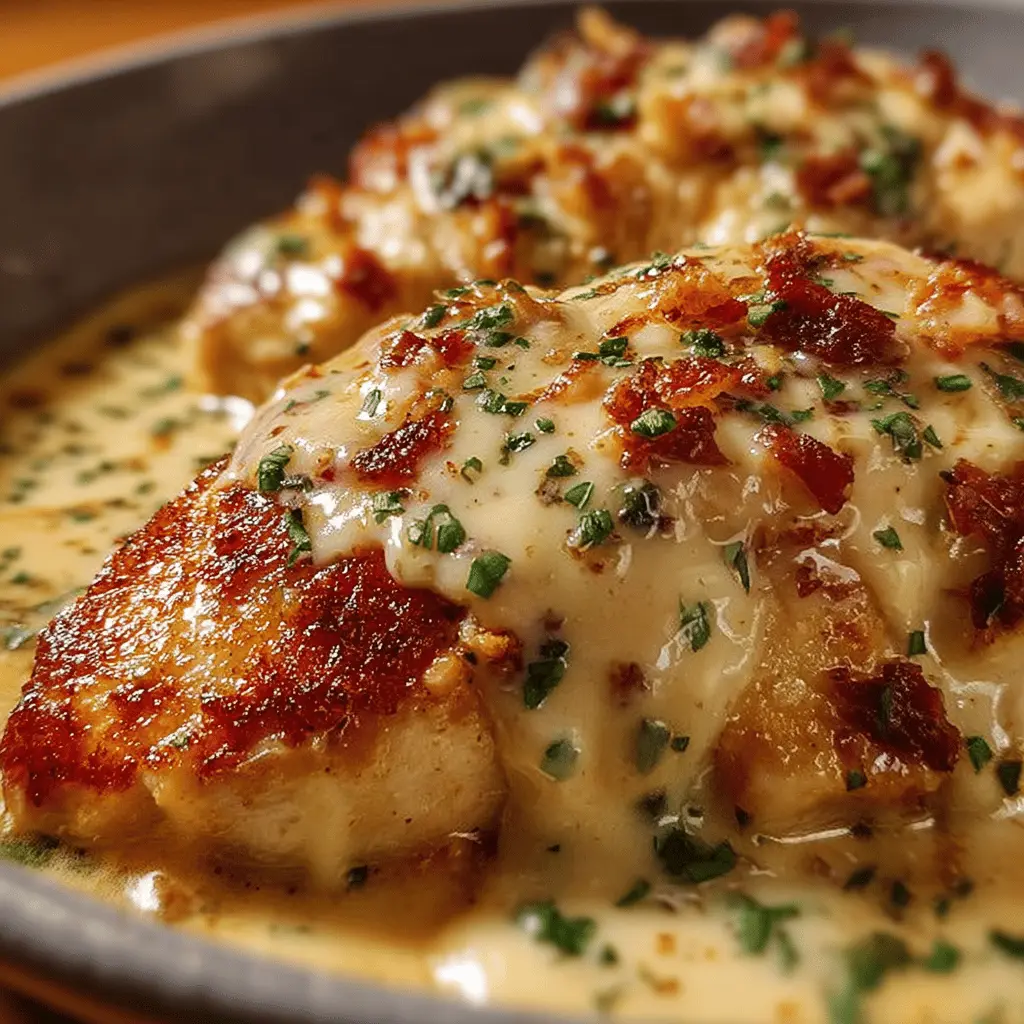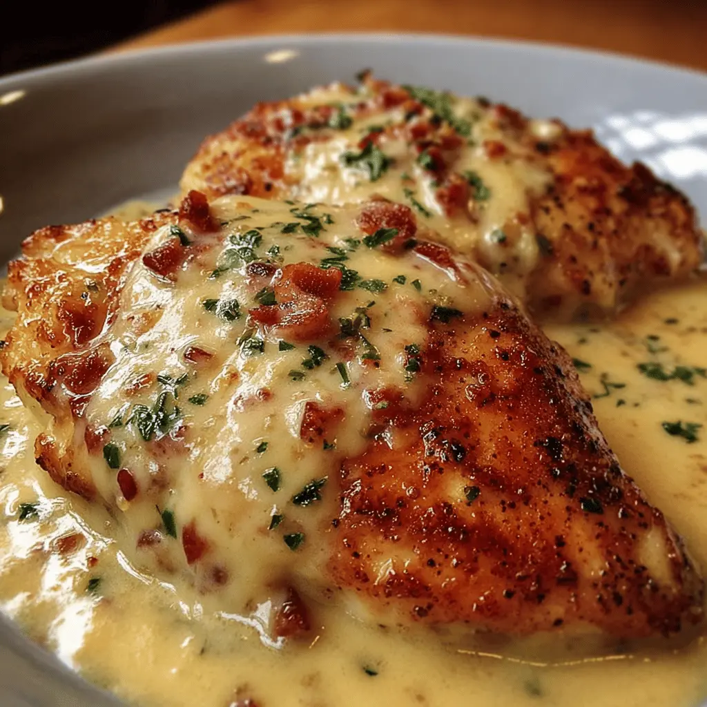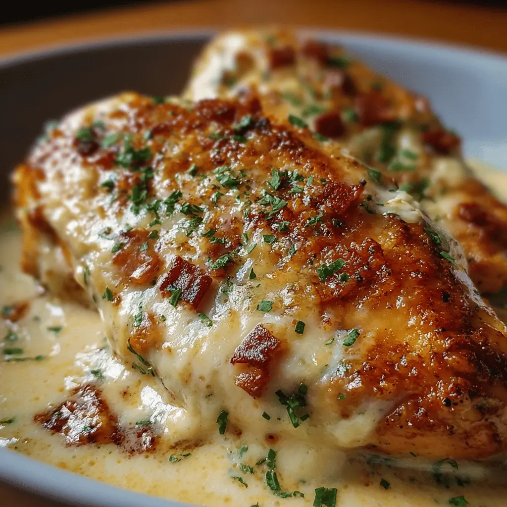 Indulge in this rich and creamy cheese chicken recipe, featuring the delightful addition of turkey bacon for a savory twist.