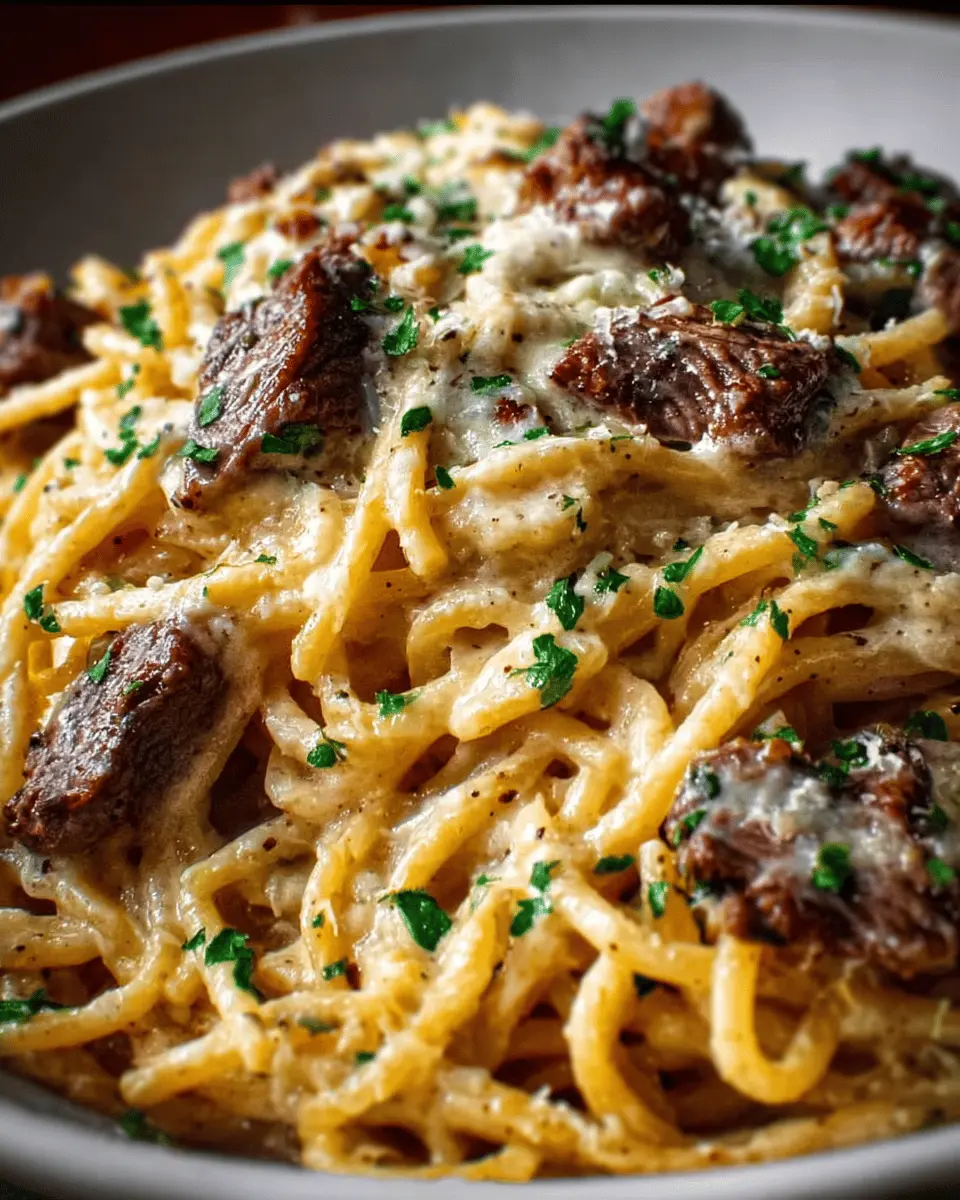 PrintSteak Alfredo Spaghetti: Indulgent Creamy Parmesan Delight