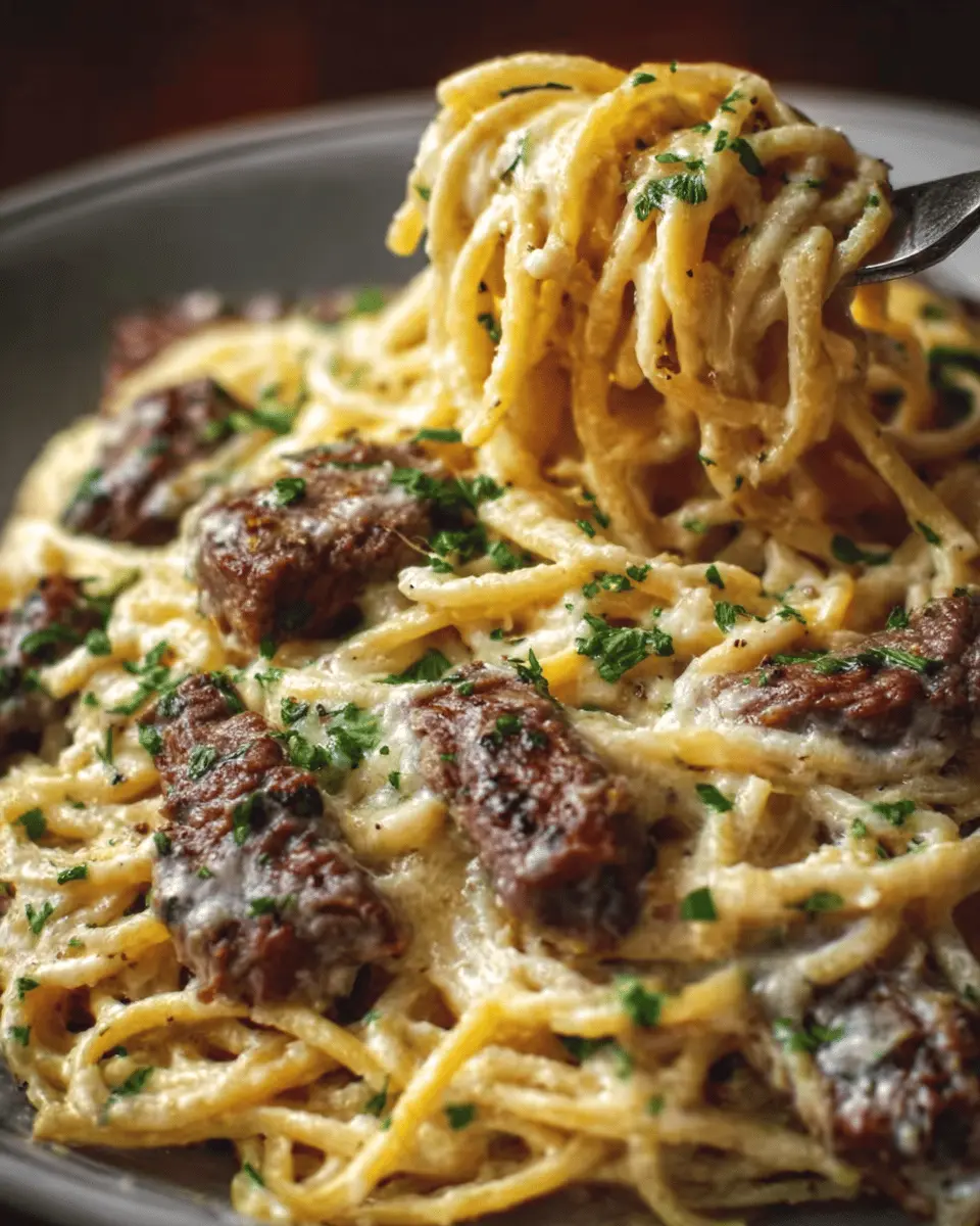 Indulge in a creamy, flavorful dish with Steak Alfredo Spaghetti, featuring rich parmesan and tender steak for a delightful meal.