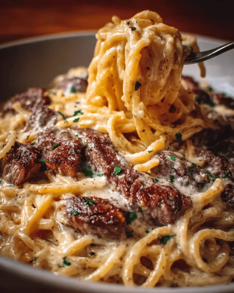 - Plate It Up: Twirl the creamy spaghetti onto plates, topping it generously with the sliced steak.