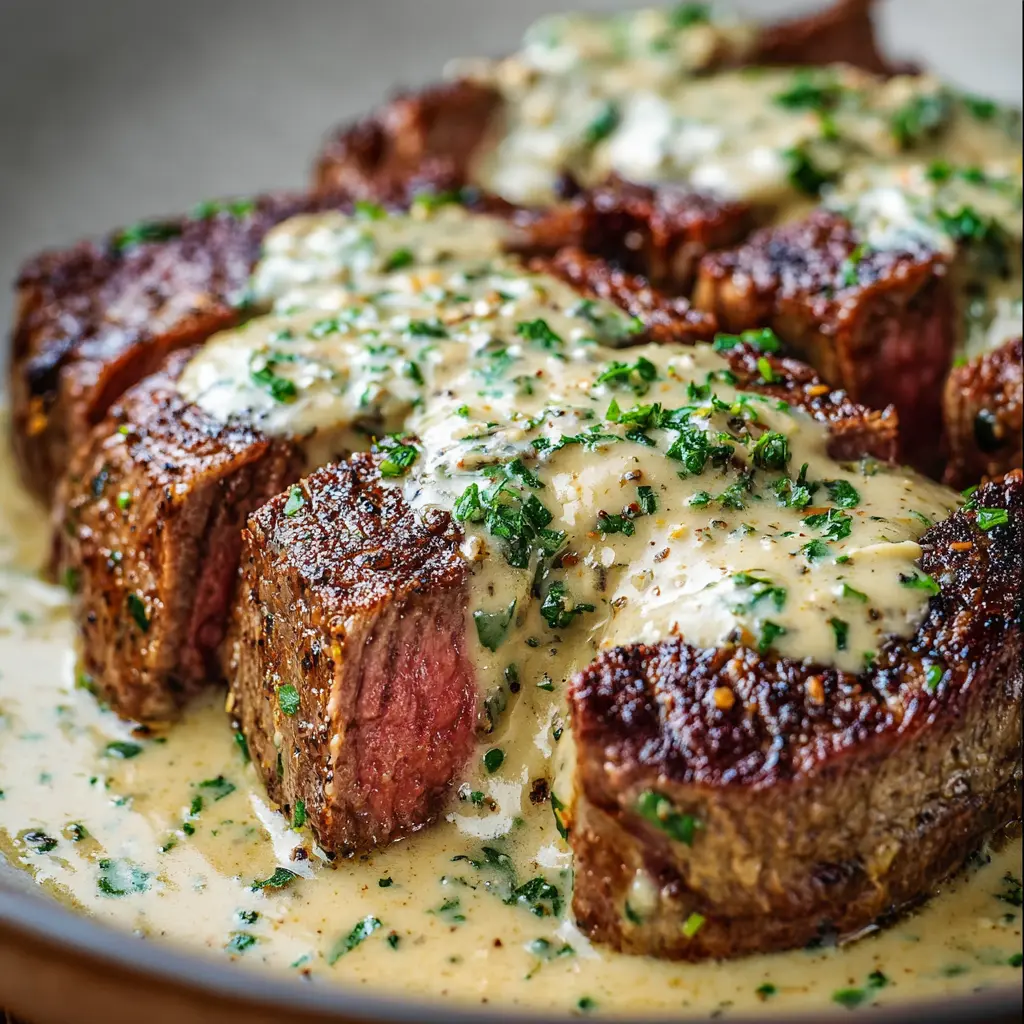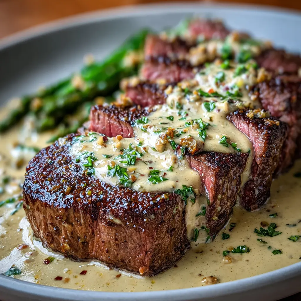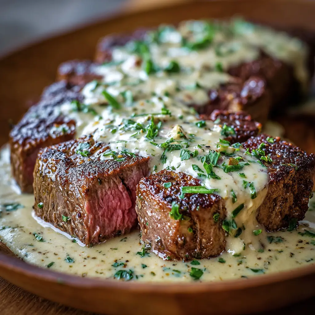 A rich and savory steak dish featuring a creamy garlic sauce that's perfect for impressing guests or enjoying a cozy night in.