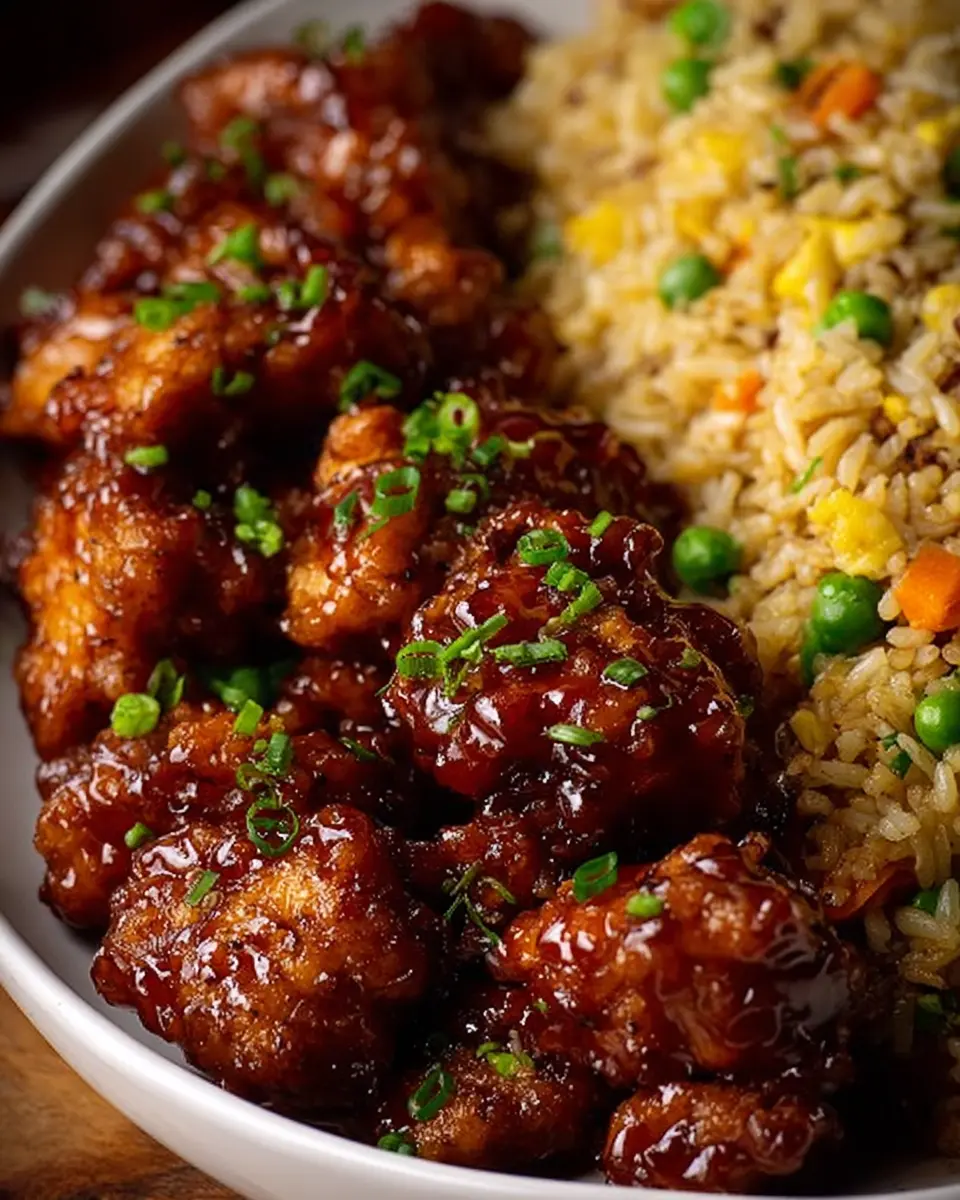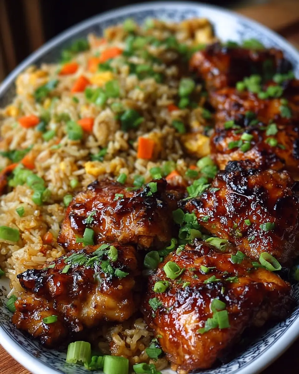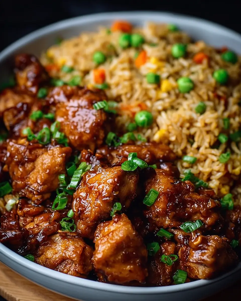 Enjoy this indulgent Sticky Bourbon-Style Chicken paired with flavorful Fried Rice.