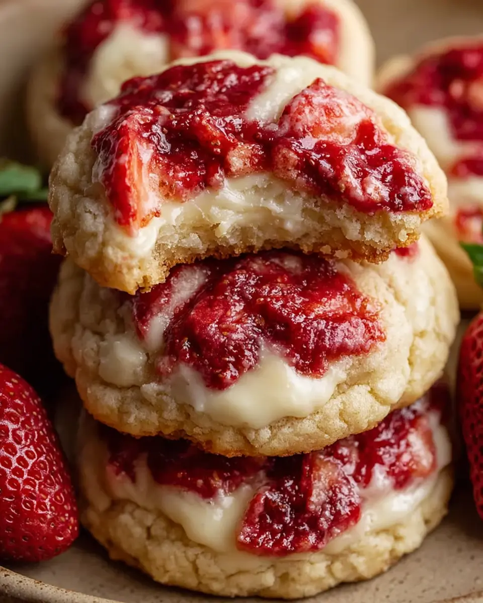 Indulge in the delightful combination of strawberries and cheesecake in cookie form.